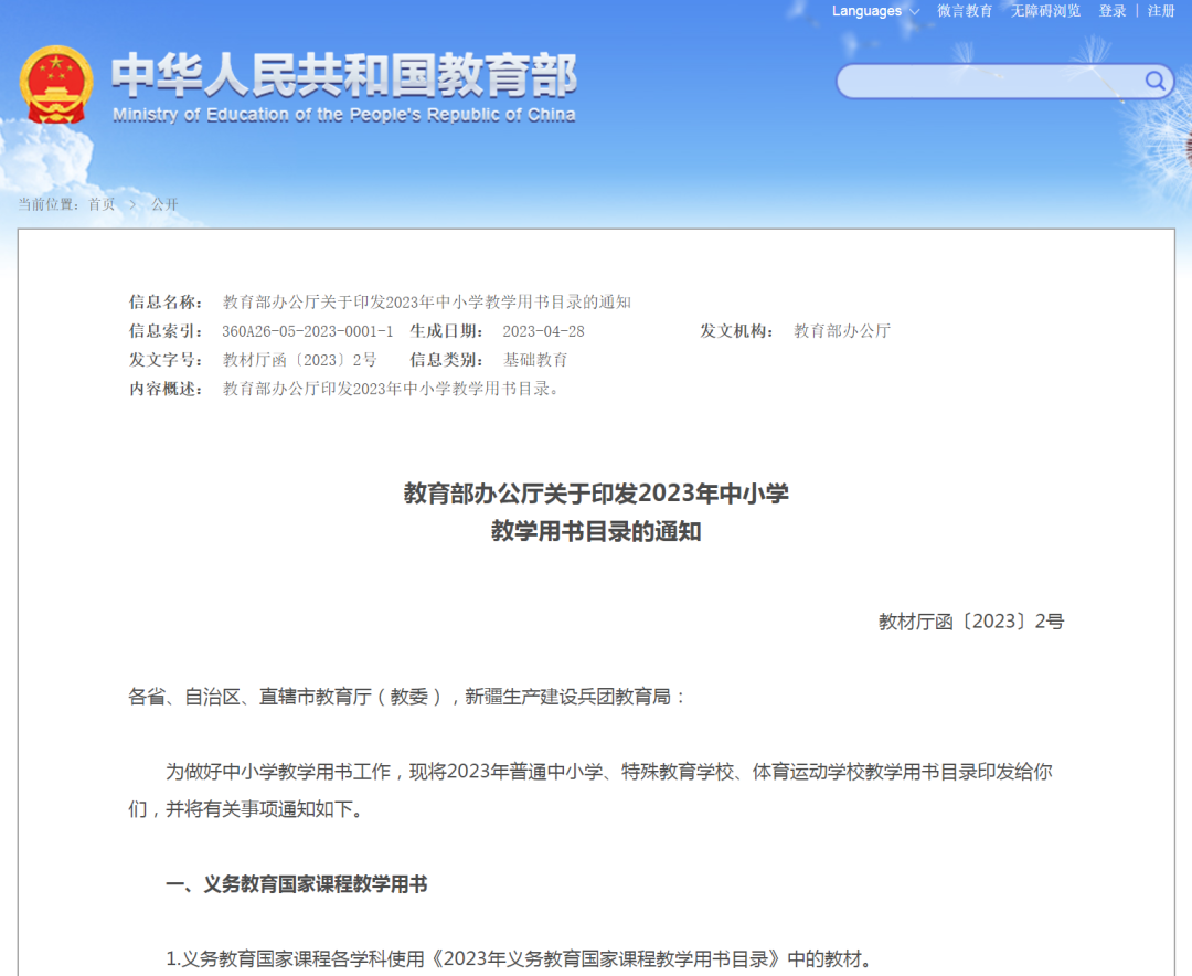教育部网站截图通知指出,义务教育国家课程各学科使用《2023年义务教育国家课程教学用书目录》中的教材。属于义务教育国家课程但目录中没有相关教材,由各省级教育行政部门根据要求确定相关课程实施方式和教学材料,如需使用教材,所用教材须正式出版并经省级教育部门审定并列入省级中小学教学用书目录。《2023年普通高中国家课程教学用书目录(根据2017年版课程标准修订)》和《2023年普通高中国家课程教学用书目录(根据2003年课程标准编写)》仍将并行。2023年秋季学期起,普通高中依据2003年课标编写的高一、高二册次教材不再列入用书目录。