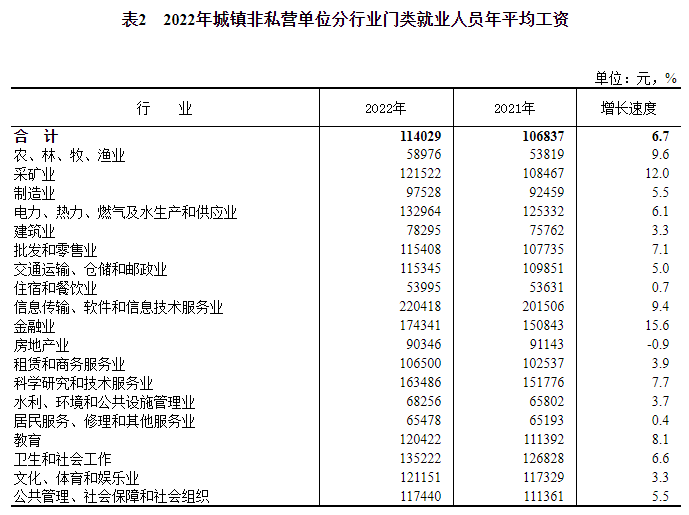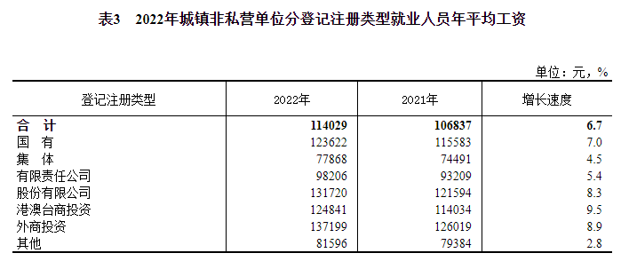 2022年,全国城镇非私营单位就业人员年平均工资为114029元,比上年增长6.7%,增速比2021年回落3.0个百分点,扣除价格因素实际增长4.6%;城镇私营单位就业人员年平均工资为65237元,比上年增长3.7%,回落5.2个百分点,扣除价格因素实际增长1.7%。