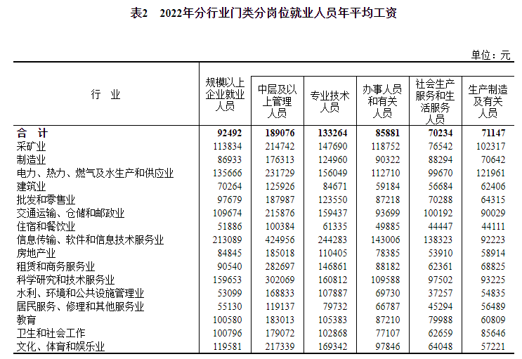 2022年全国规模以上企业就业人员年平均工资为92492元,比上年名义增长5.0%。其中,中层及以上管理人员189076元,增长4.7%;专业技术人员133264元,增长6.6%;办事人员和有关人员85881元,增长4.1%;社会生产服务和生活服务人员70234元,增长3.3%;生产制造及有关人员71147元,增长3.9%。