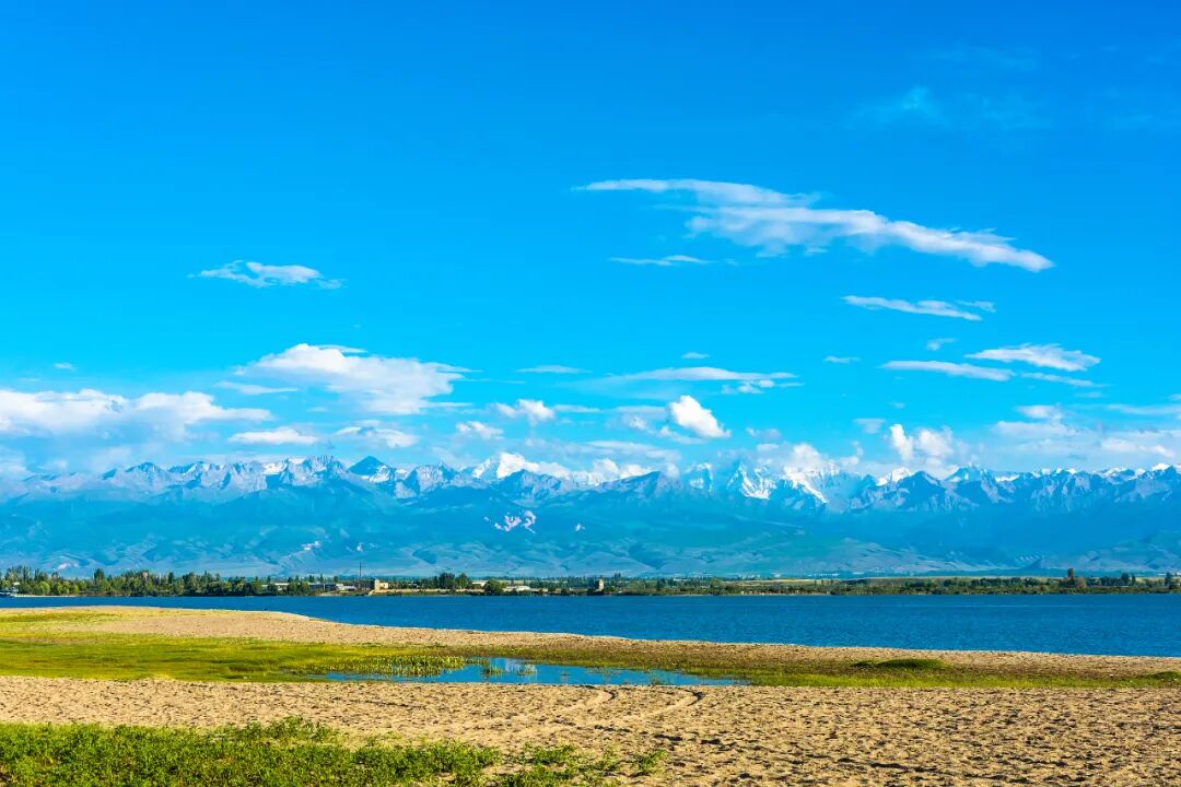 山间点缀着数以千计的晶莹湖泊,这些高山湖泊与周围的雪峰、高山草甸、雪岭云杉、牧民毡房等交织在一起,美不胜收。其中最耀眼的明珠当属伊塞克湖。当地有这么一句话,“没有到伊塞克湖,就不算到吉尔吉斯。”伊塞克湖也被称为“半空中的一面镜子”,这面“镜子”有6000多平方公里这么大,湛蓝清澈,倒映着天光云影和四周雪山。