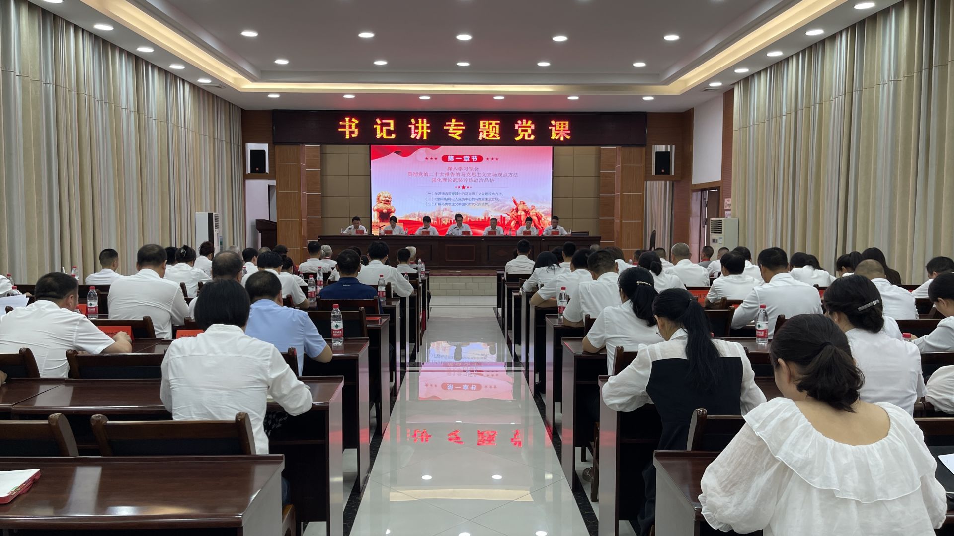 马家店街道党工委书记谭俊以《学思领悟二十大 踔厉奋发新征程》为题,紧紧围绕党的二十大精神的丰富内涵和实践要求,从三个方面给与会人员上了一堂精彩的专题党课,引导全体党员干部铭记党的百年历史、弘扬伟大建党精神、保持清醒政治头脑、自觉做到严于律己。