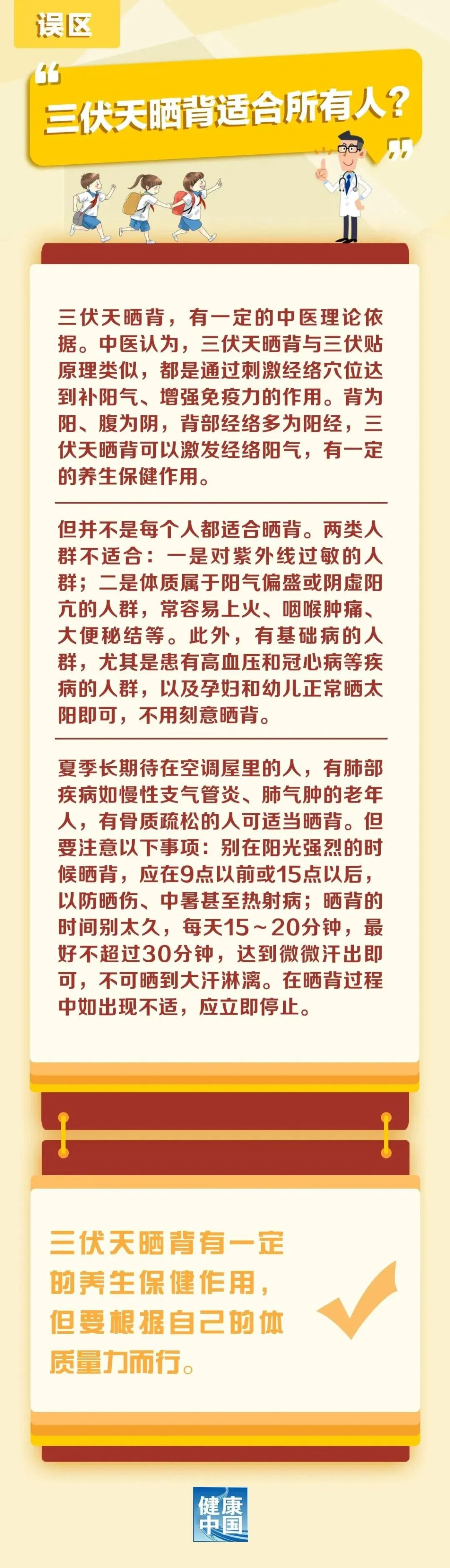 科学排雷 | 三伏天晒背,你也被“种草”了?千万别晒错 2023-07-25 09:24 0 三伏天里,很多读者最关心的话题就是“如何充分利用这段时间好好养生”。上期有网友提问: 今天,我们就请专家来解答。 来源:健康中国