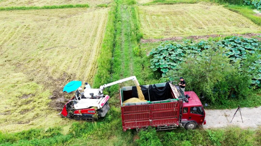 枝江融媒(记者 朱瑶)8月18日,站在董市镇泰洲村的再生香稻示范田边望去,延绵起伏的稻田里,黄澄澄的稻谷颗粒饱满,沉甸甸的稻穗随风晃动,一边是收割机在田里来回穿梭,一边是货车在田边等待装车。