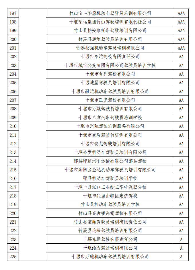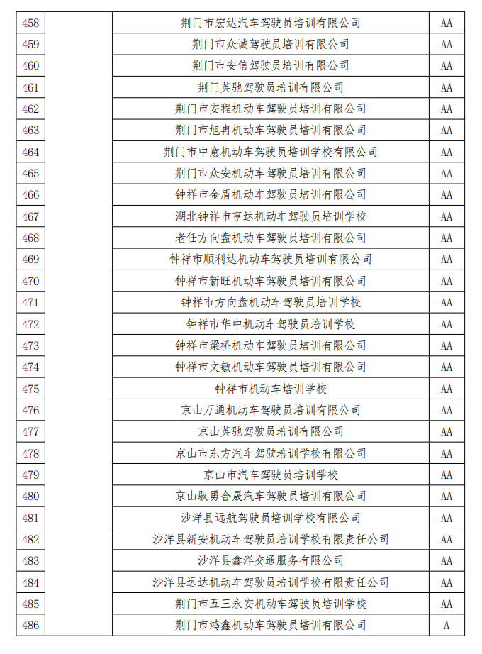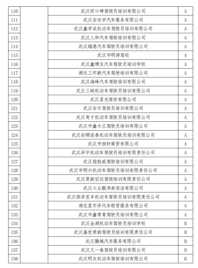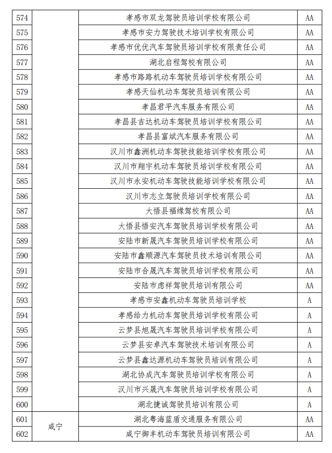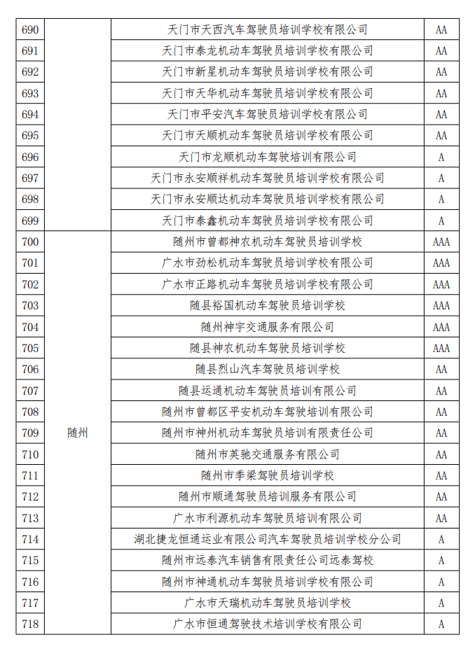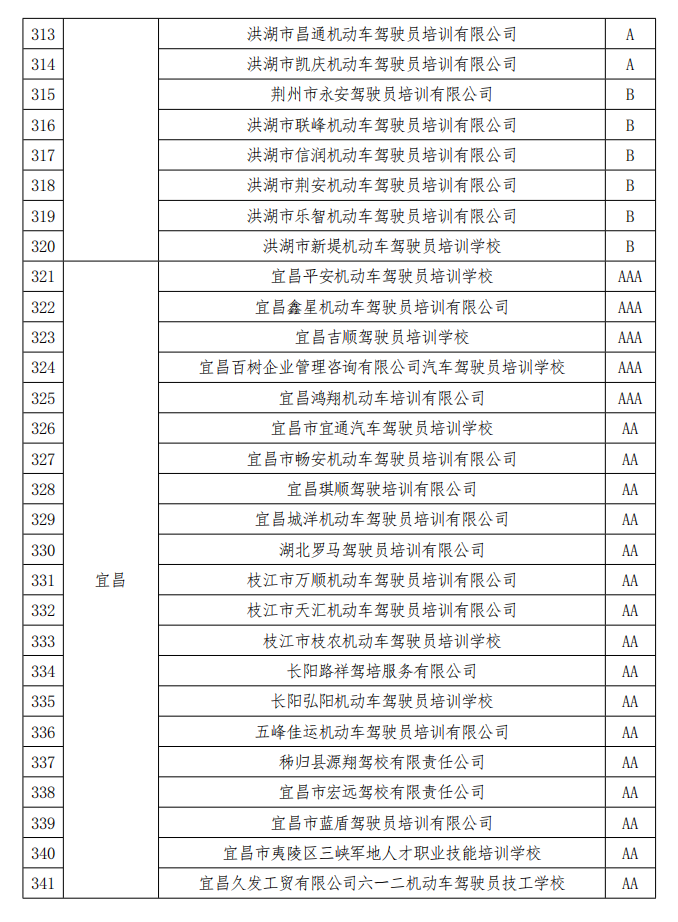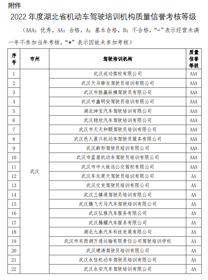 为规范机动车驾驶培训机构经营行为,提高培训质量和服务水平,依据《机动车驾驶员培训管理规定》(交通运输部令2022年第32号)和《关于印发<湖北省机动车驾驶培训机构质量信誉考核办法>的通知》(鄂运物综运[2017]3号)要求,我中心组织了2022年度机动车驾驶培训机构质量信誉考核工作。通过县级考核、公示,市级公示、上报全省共有728家机动车驾驶培训机构参加考核,考核结果为:AAA级110家,AA级391家,A级171家,B级31家;另有经营未满一年不参加当年考核21家、因故未参加考核4家。现将2022年度湖北省机动车驾驶培训机构质量信誉考核等级结果向社会予以公布。