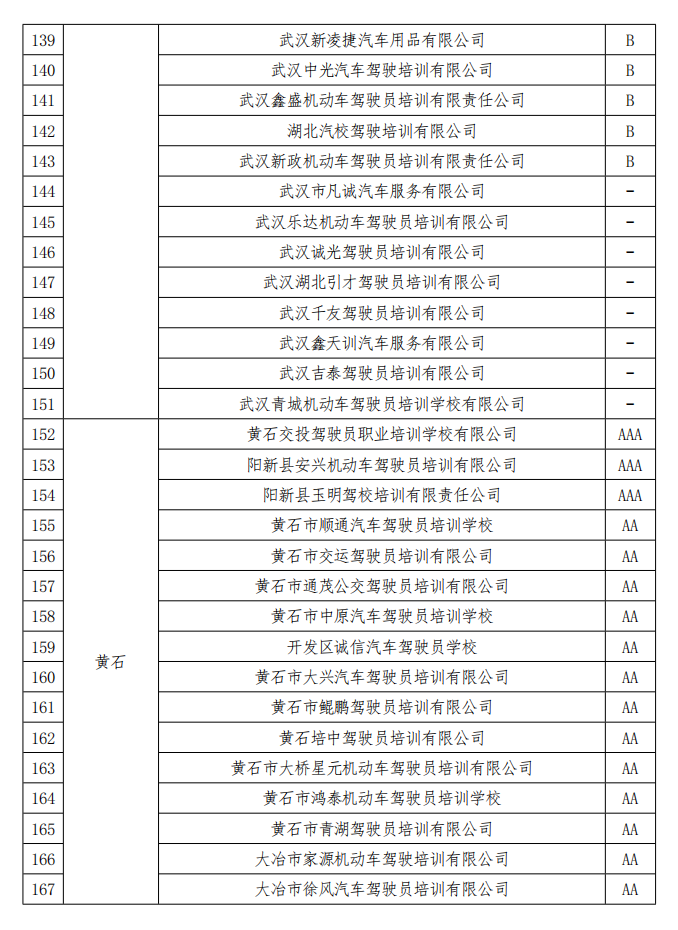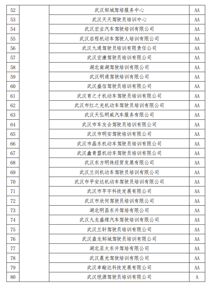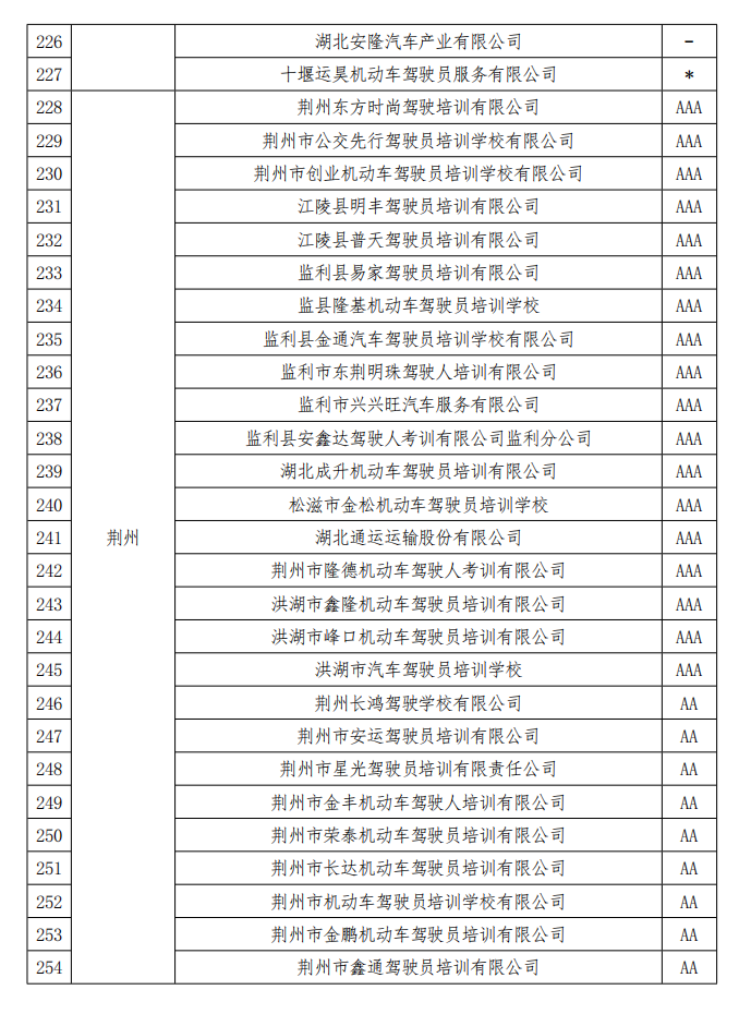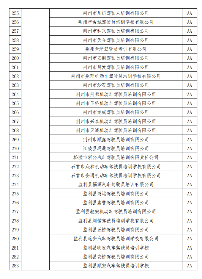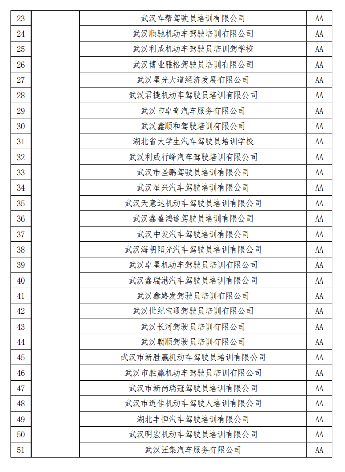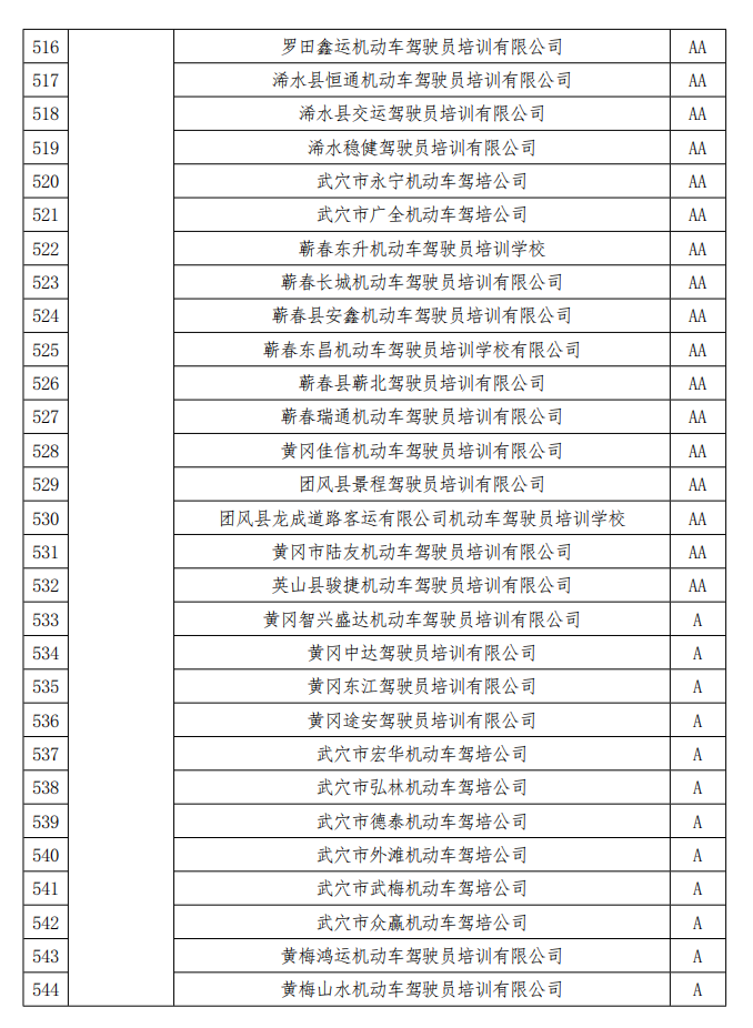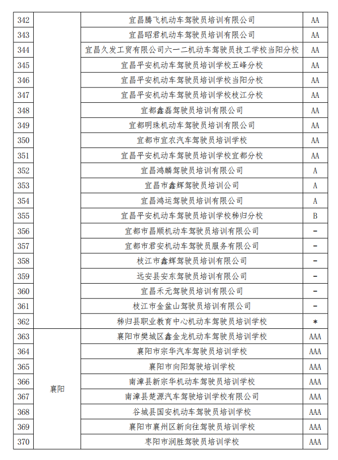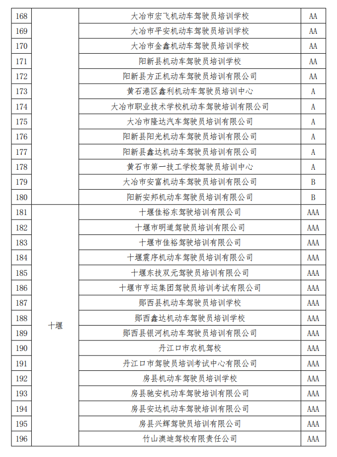 为规范机动车驾驶培训机构经营行为,提高培训质量和服务水平,依据《机动车驾驶员培训管理规定》(交通运输部令2022年第32号)和《关于印发<湖北省机动车驾驶培训机构质量信誉考核办法>的通知》(鄂运物综运[2017]3号)要求,我中心组织了2022年度机动车驾驶培训机构质量信誉考核工作。通过县级考核、公示,市级公示、上报全省共有728家机动车驾驶培训机构参加考核,考核结果为:AAA级110家,AA级391家,A级171家,B级31家;另有经营未满一年不参加当年考核21家、因故未参加考核4家。现将2022年度湖北省机动车驾驶培训机构质量信誉考核等级结果向社会予以公布。
