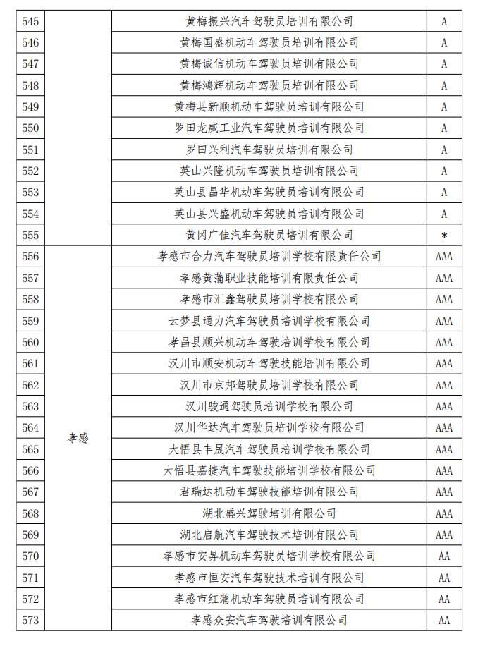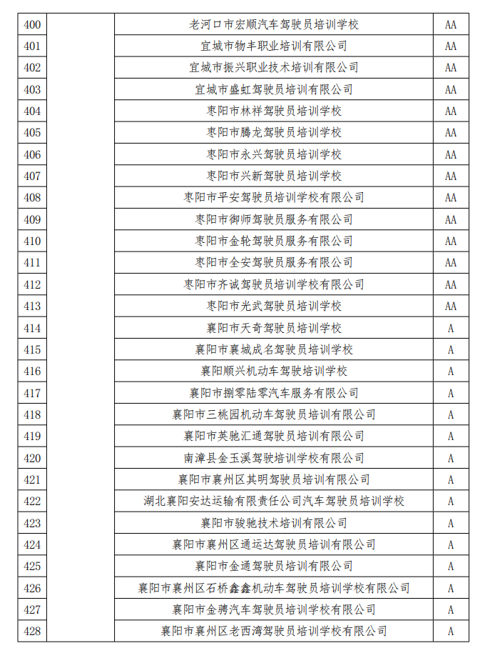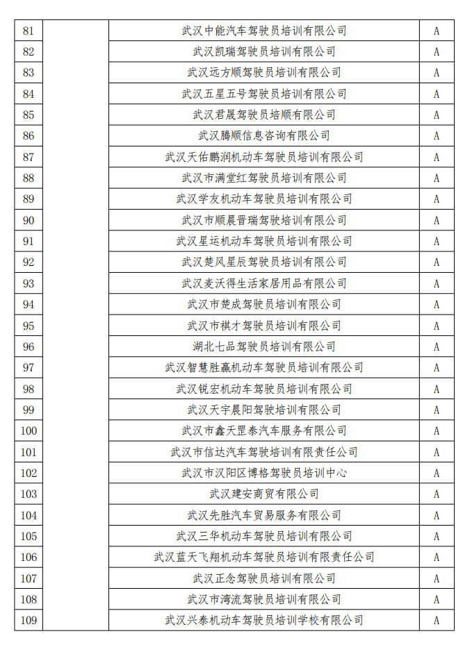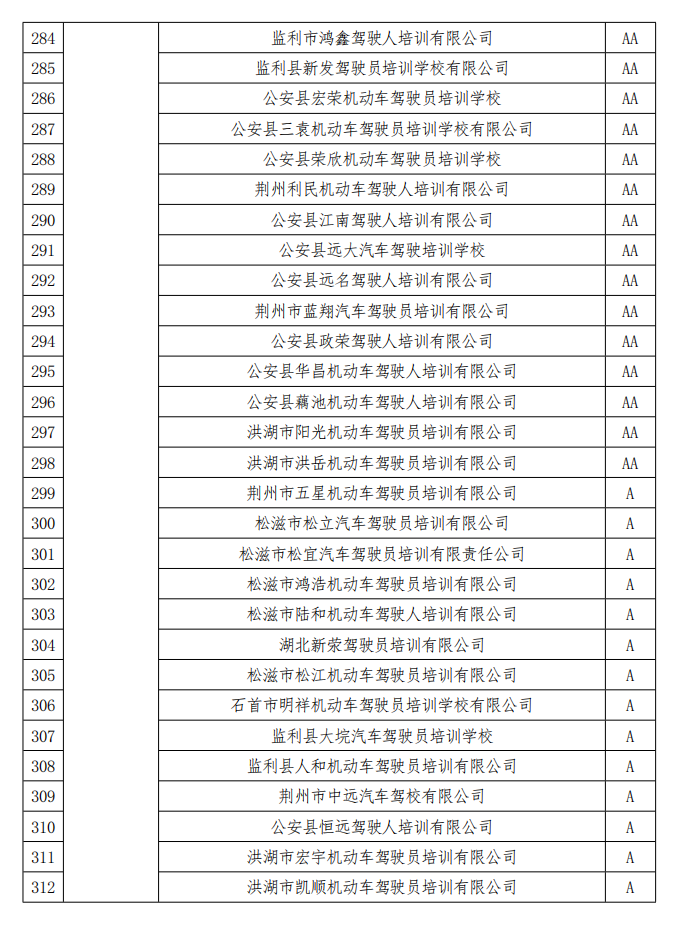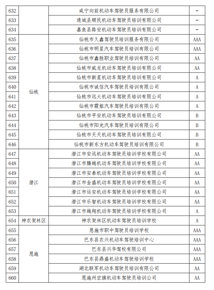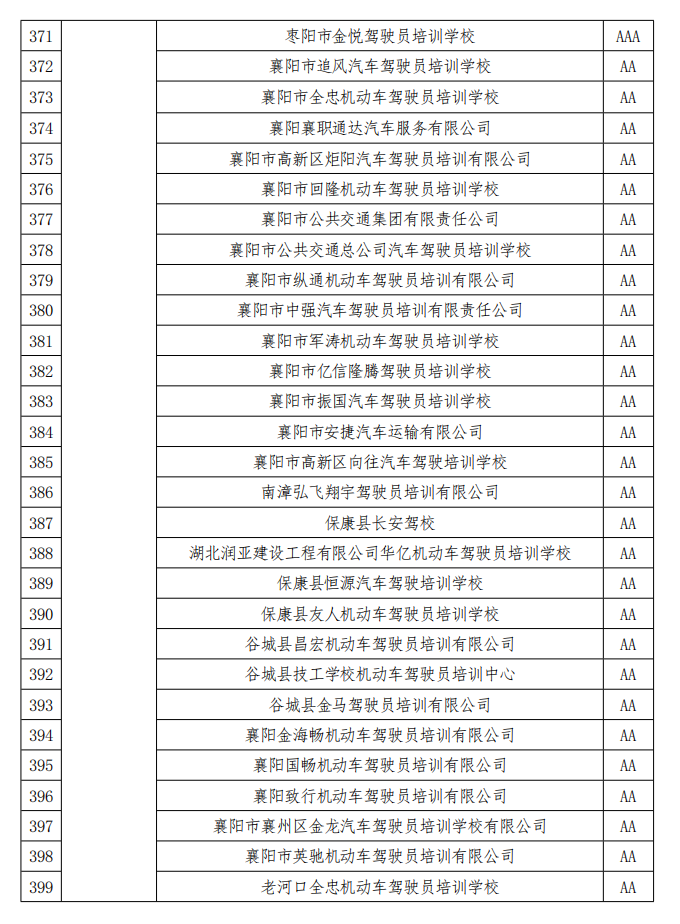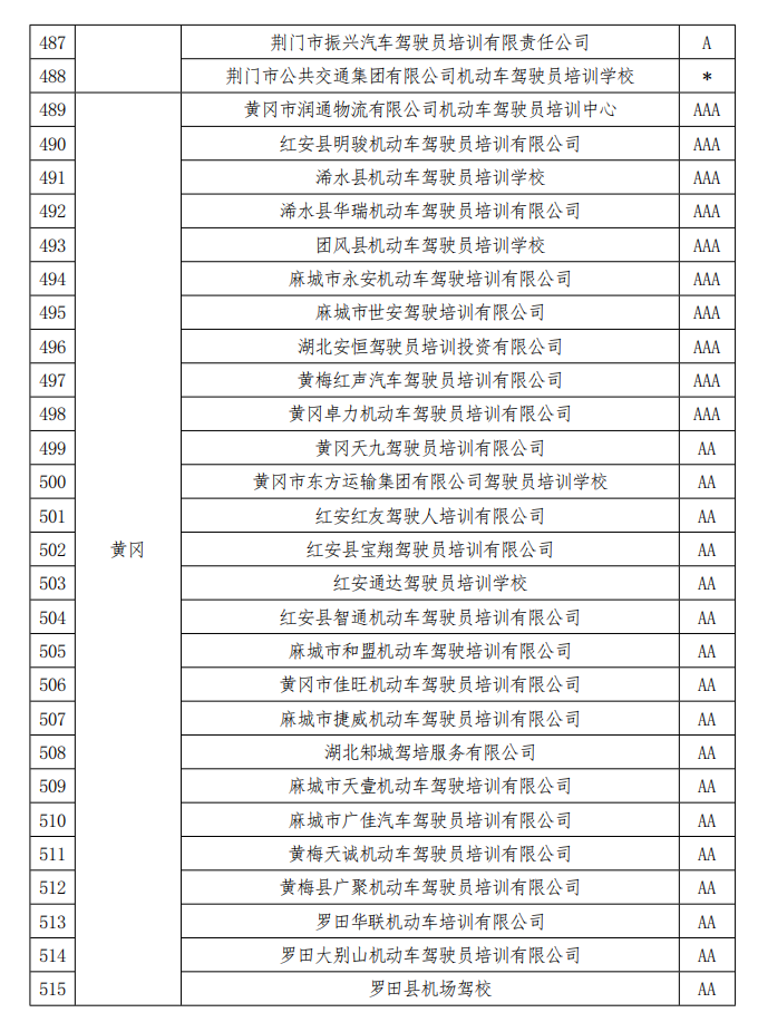 为规范机动车驾驶培训机构经营行为,提高培训质量和服务水平,依据《机动车驾驶员培训管理规定》(交通运输部令2022年第32号)和《关于印发<湖北省机动车驾驶培训机构质量信誉考核办法>的通知》(鄂运物综运[2017]3号)要求,我中心组织了2022年度机动车驾驶培训机构质量信誉考核工作。通过县级考核、公示,市级公示、上报全省共有728家机动车驾驶培训机构参加考核,考核结果为:AAA级110家,AA级391家,A级171家,B级31家;另有经营未满一年不参加当年考核21家、因故未参加考核4家。现将2022年度湖北省机动车驾驶培训机构质量信誉考核等级结果向社会予以公布。