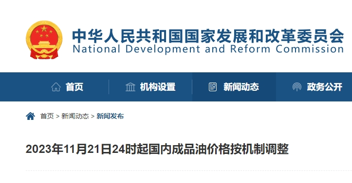 据国家发改委网站消息,根据近期国际市场油价变化情况,按照现行成品油价格形成机制,自2023年11月21日24时起,国内汽、柴油价格(标准品,下同)每吨分别降低340元、330元。