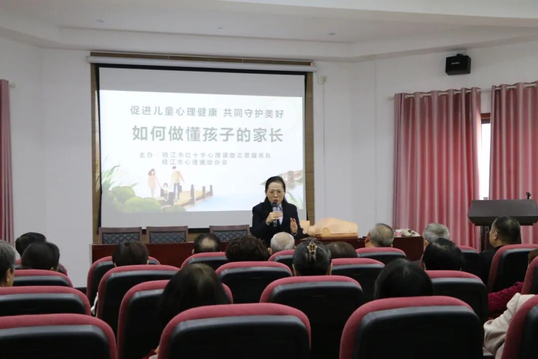 随后,由枝江市红十字会党组书记、常务副会长姚芳主持,市红十字心理援助志愿服务队郭丽丽老师开展了心理健康知识讲座,郭老师以“促进儿童心理健康 共同守护美好未来——如何做懂孩子的家长”为主题,以“您爱孩子吗?”和“您懂孩子吗?”两个问题,引导在座的家长思考日常生活中自己的教子方法。通过讲解身边案例、开展“注意力方向”、“抓手指”等小游戏,启发家长觉察,帮助家长们学习教育孩子的方法。