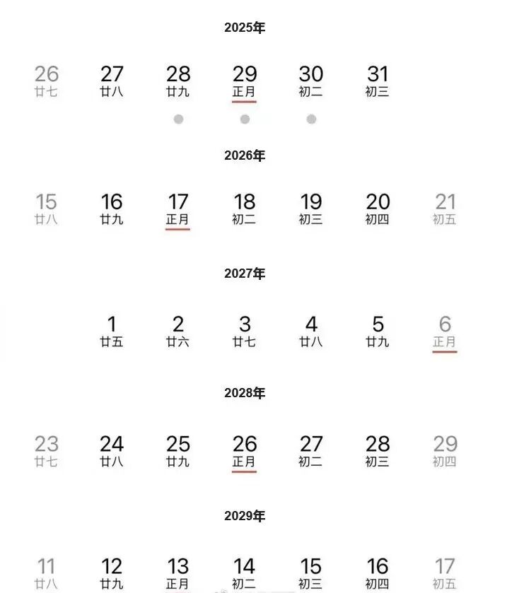 这些日子分别是:2025年1月28日、2026年2月16日、2027年2月5日、2028年1月25日和2029年2月12日。