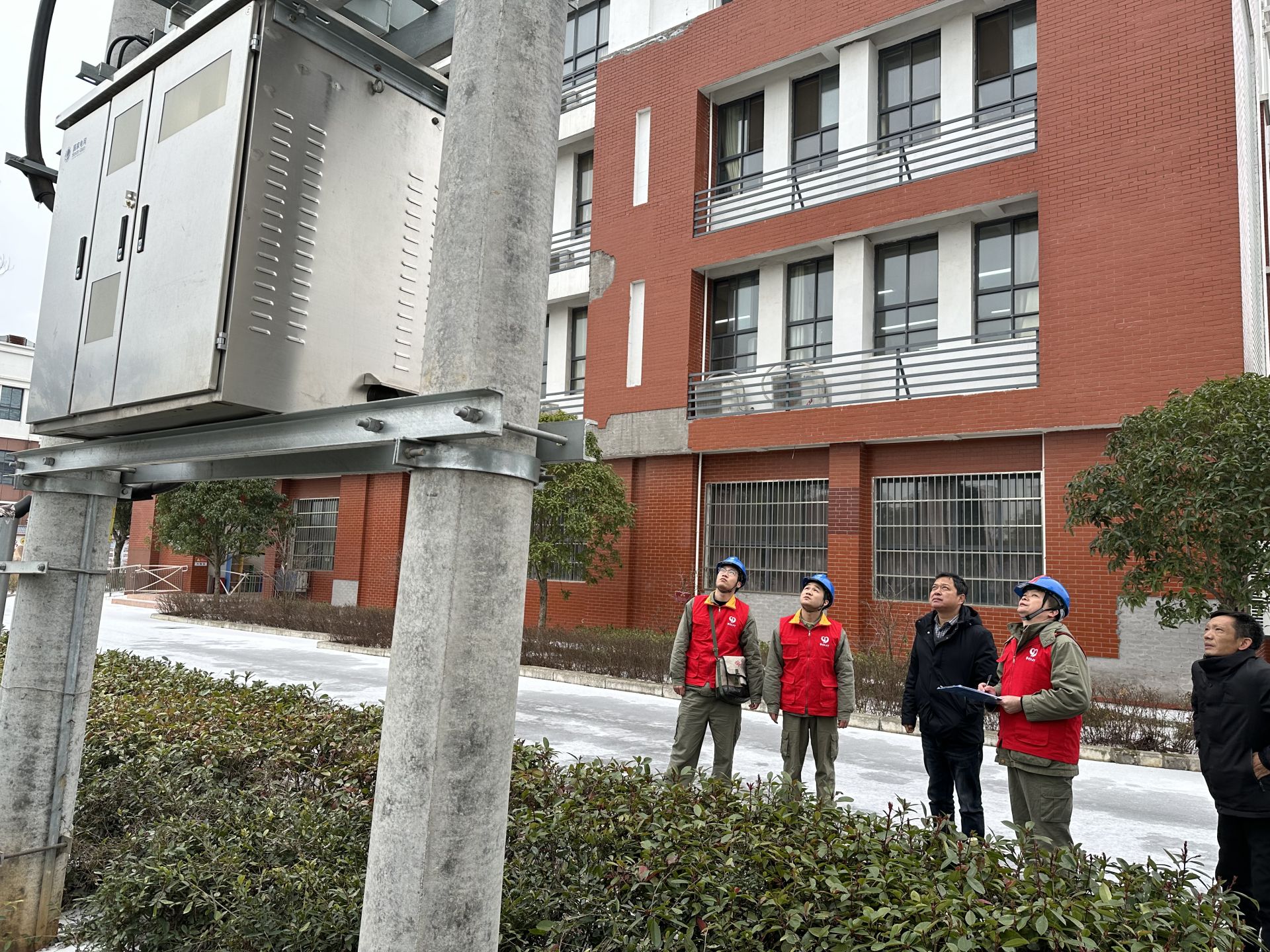 顾家店供电所“鄂电红马甲”对教学楼、食堂、宿舍、配电房等场所进行全面检查,从变压器到教室主线,开关、插座、漏电保护器等设备逐一检查测试。