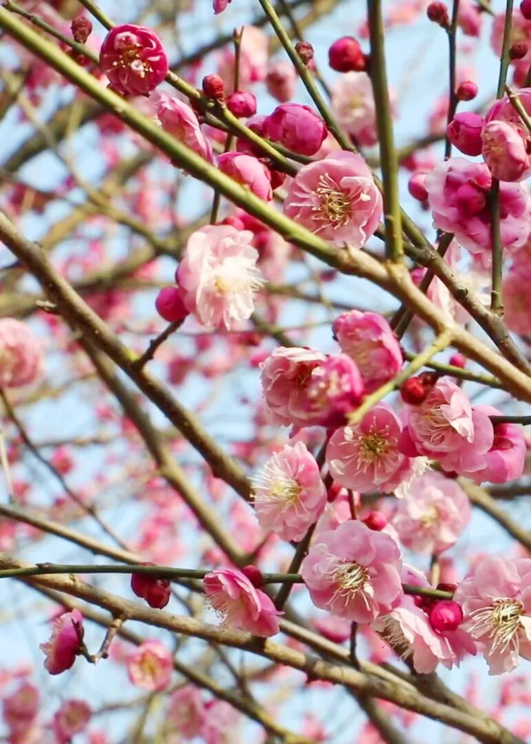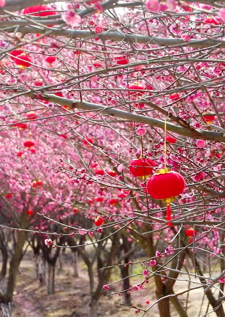 据枝江市问安镇殿春红梅园总经理万志平介绍,殿春梅园共300多亩,以美人梅、骨里红等品种为主,赏花期持续到3月中旬。每年2到3月,园中万朵梅花齐放,清风徐来,梅海红浪翻滚,蔚为壮观。