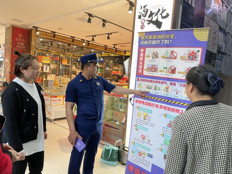 “节日期间请注意家庭防火安全,电动自行车不要在门厅、走廊、楼梯间等区域停放或充电,及时清理楼道、安全出口、消防通道内杂物,以免造成火灾隐患……”在七星新天地购物广场、北山超市、丰坪巷小商品市场等人流量集中地段,消防宣传员设置流动式“蓝朋友”消防咨询点,设立“居民家庭消防安全”“电动自行车安全”等主题海报展架,向过往人群发放防火手册等宣传资料,耐心讲解火灾的危害性、如何预防家庭火灾、如何扑救火灾以及如何正确疏散逃生等消防安全基本知识,热情解答市民群众提出的各类消防问题困惑,引导市民群众自觉关注消防安全。同时消防宣传员在商场入口、市场内等醒目位置张贴消防安全公益海报,叮嘱商场、超市负责人及商户注意用火、用电、用气安全,加强日常消防安全管理,落实火灾防范措施,确保自身及顾客的人身安全。