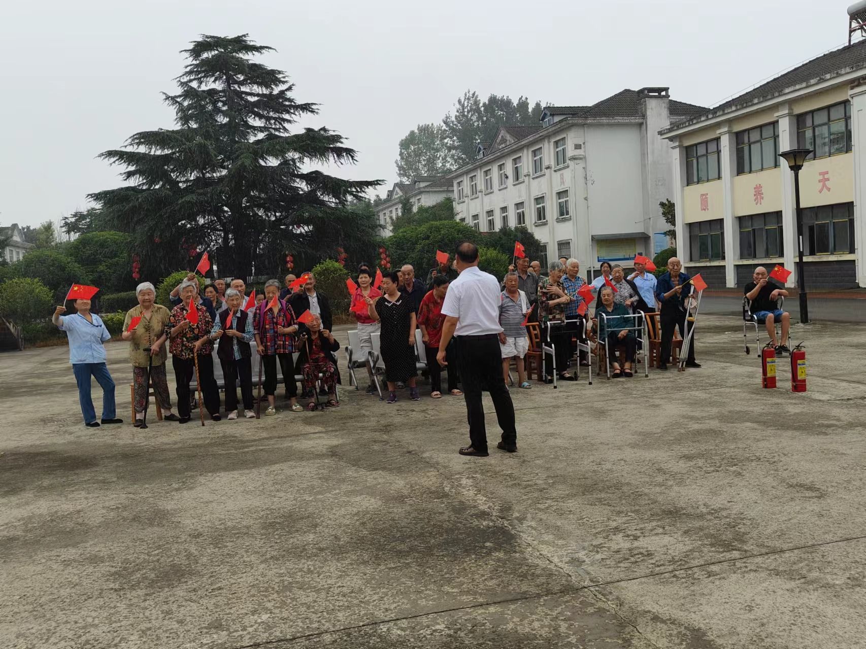 活动中,老人们一起参加升国旗、唱国歌仪式,伴着气势磅礴的国歌声,鲜艳的五星红旗缓缓升起,老人们目光追随,饱含深情。在飘扬的国旗下,院民们围坐谈心,分享生活感受,盛赞党的政策给人民群众带来的切实福利。随后,福利院工作人员为院民分发水果、牛奶等福利物资,老人们度过了轻松愉快但意义非凡的一个节日。