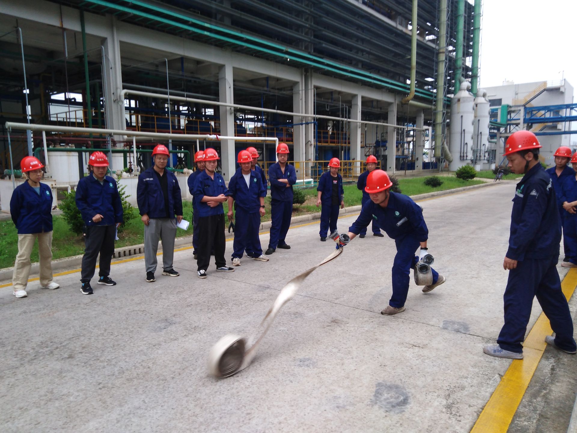 比赛共设9个小组,每组2人参赛。每组人员必须完成甩开水带、铺设水带、接分水器、接水带等环节,用时最短的队伍获胜。赛场上,参赛人员全神贯注,配合默契,比速度、比技巧、比心理素质。经过激烈的竞争,最终公用工程部和污水站组合以33秒时长的成绩获得本次比赛的第一名。