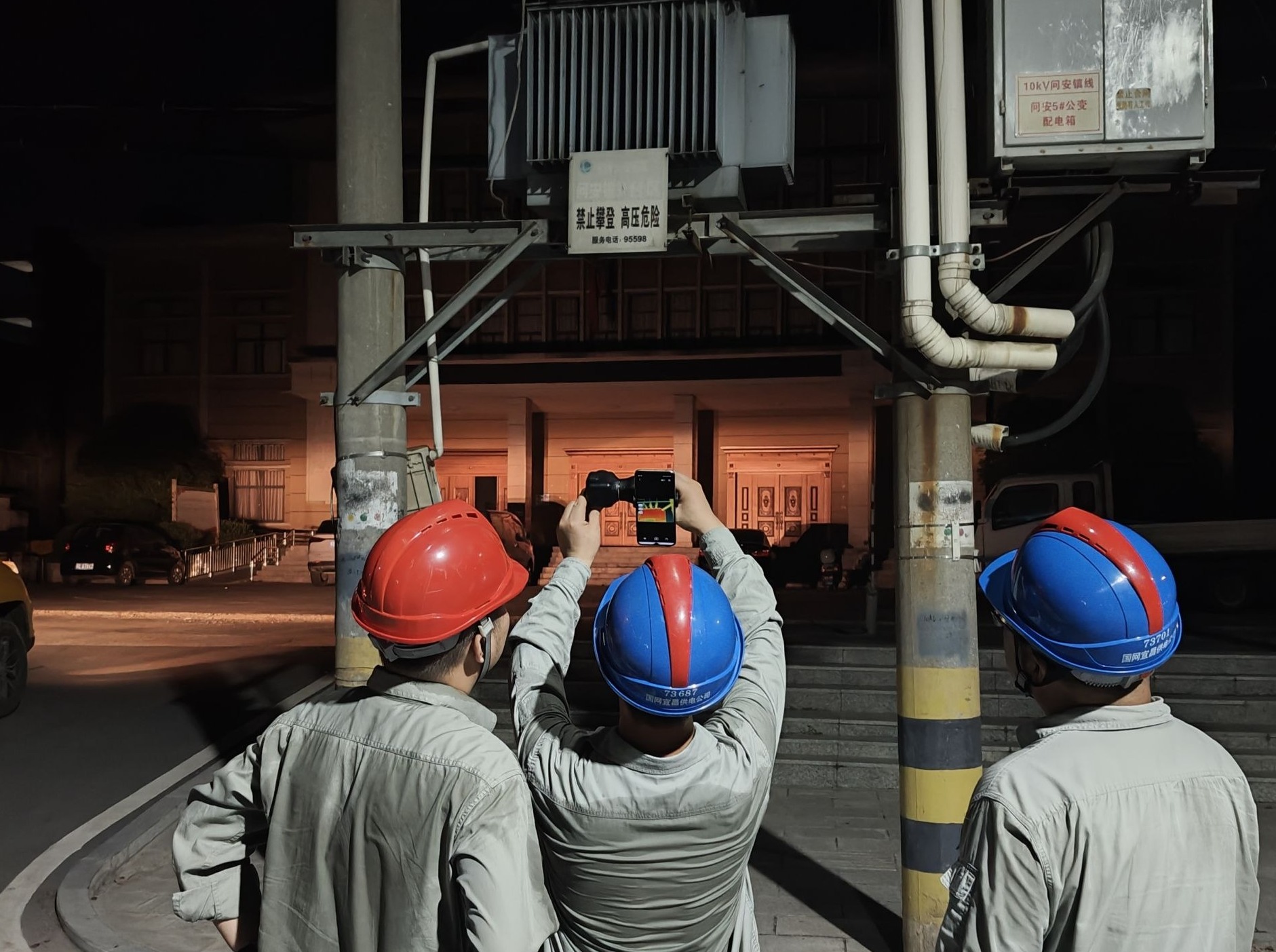 虽已夜幕降临,气温仍高达38℃,他们身着工装,手持红外测温仪,穿行在乡村小道,来到龙泉堂村1号台区。因系统监测到该台区存在重载情况,他们对跌落保险、变压器的高低压桩头、保护器进出线连接点、变压器体等容易发热的部位进行了红外测温。