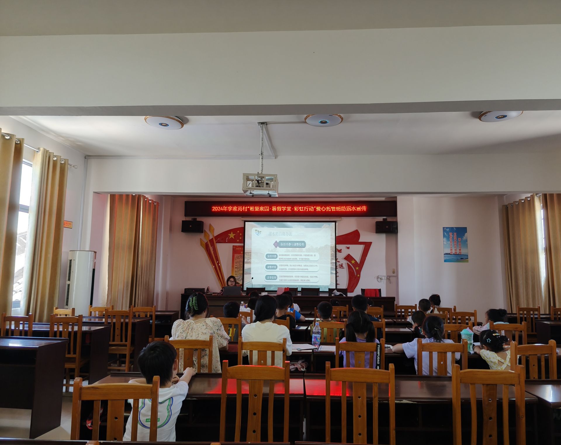 “同学们,你们知道一个人溺亡需要多少秒吗?”在实践站的课堂上,大学生志愿者用真实的视频、鲜活的案例和触目惊心的数据,告诉同学们溺水的惨痛后果,并重点讲解了如何防止溺水事故发生、溺水自救和互救等内容。这是在李家岗村新时代文明实践站开展“我在文明实践站里过暑假”活动的第一课。