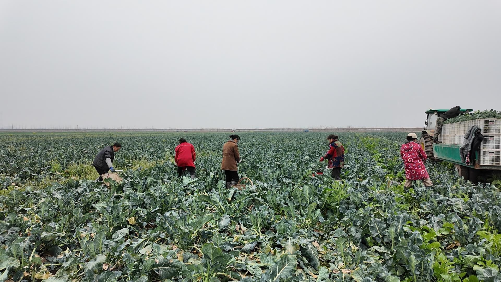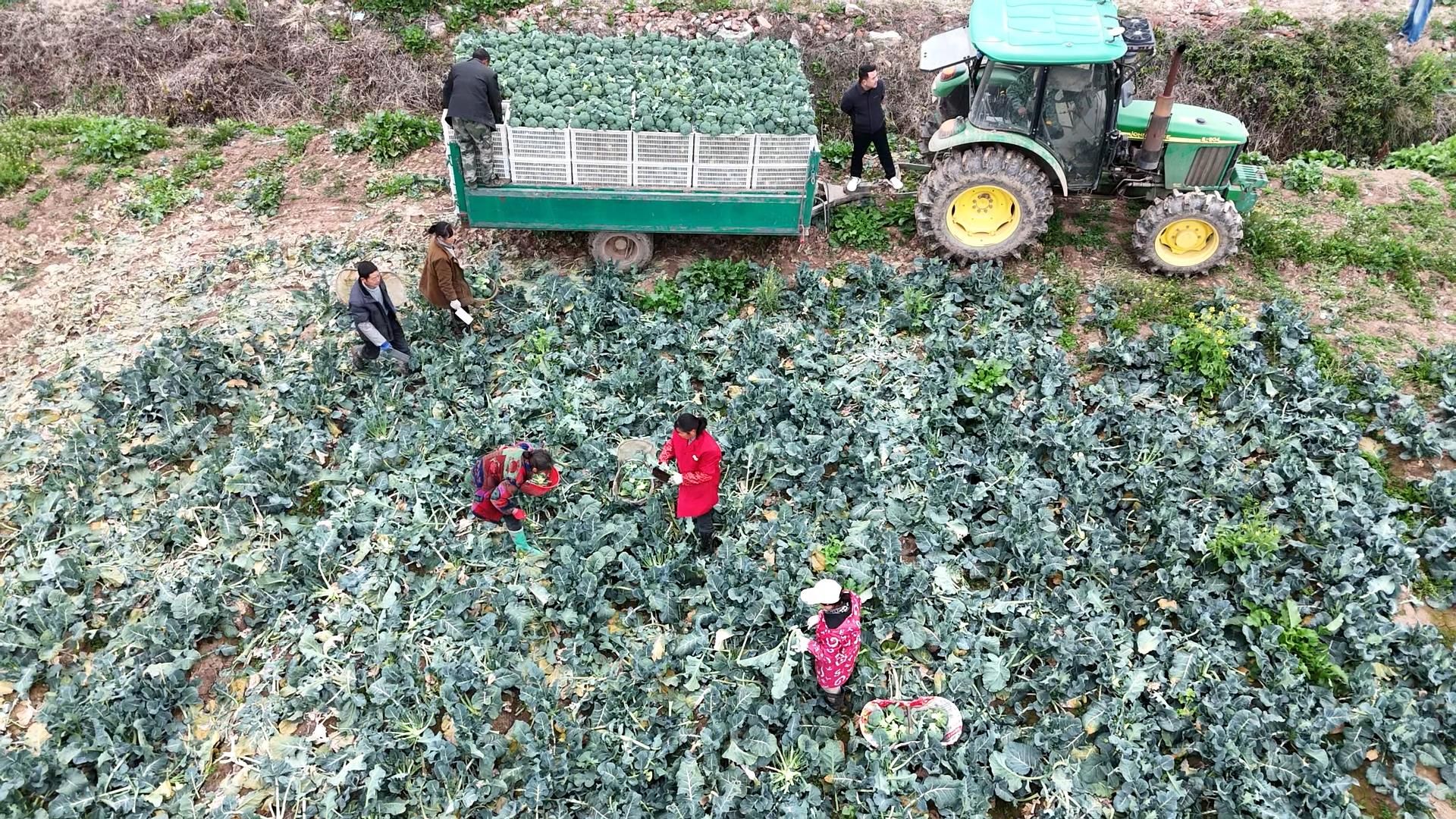 2月20日,走进金家店果蔬种植基地,一垄垄西兰花长势喜人,放眼望去,成片的西兰花花球饱满、色泽鲜绿,采收人员来回穿梭,娴熟地将花球切下装进身边的筐篓内,不一会儿,装满西兰花的筐篓就被工人们运送到田边的运输车旁,整齐地码放上车。