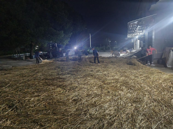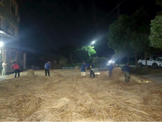 “天气预报说明天有雨,老刘家的稻穗还没碾,咱们今晚搭把手!”晚饭刚过,村民胡大叔便在门口喊了一声,很快,几位邻居便扛着木架、拿着扫帚,陆续赶到刘道丕家的晒谷场。原来,由于近期雨水充沛,导致刘道丕家的稻谷大面积倒伏,收割机无法完成收割,只能人工收割,人工脱粒。