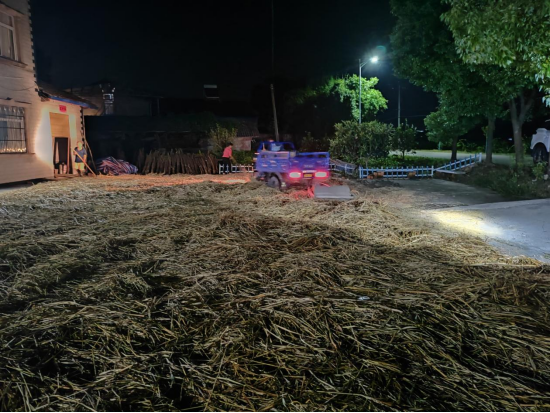 大家手脚麻利地忙活起来。有人将捆好的稻穗均匀铺在晒谷场中央,摆成整齐的“稻穗阵”;有人合力将半人高的青石碌碡架上木架,再套上绳索;用三轮车拉着碌碡缰绳,沿着稻穗铺就的轨迹匀速行走,“咕噜咕噜”的碾轧声在夜空中格外清晰,谷粒随着碌碡的滚动不断从稻穗中脱落;村民们蹲在一旁,手持羊叉,将碾过的稻秆与谷粒初步分离,还不时提醒拉碌碡的人:“慢些走,碾匀点。”年长的王大爷经验足,守在碌碡旁,时不时调整木架角度,“这老碌碡虽不如机器快,但碾得干净,不浪费谷粒,咱们老办法也能守住好收成!”
