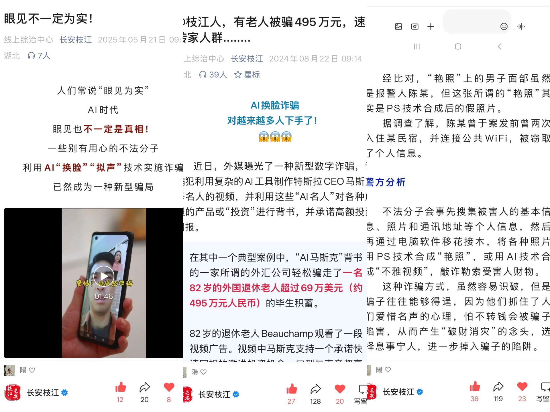 今年以来,市委政法委牵头制发防范AI养老诈骗宣传单5000余份,覆盖城乡社区;组织骨干力量深入农村村落、养老机构开展面对面宣讲,并发放实用宣传品;市公安局各派出所结合“法治宣教”活动开展反电诈宣传17场次,发挥“小手拉大手”作用。此外,还组建了由网格员、志愿者等组成的专业化反诈宣传队伍,定期开展老年群体防诈培训,通过案例复盘与模拟演练提升应对能力;编发反诈指南,强化警格对接,精准开展面对面预警宣教;线上通过“长安枝江”微信公众号精准推送AI养老诈骗防范知识,利用村居网格微信群转发“反诈日记”30余篇、警情通报15期,依托全媒体平台加强公益宣传引导,全面提升老年群体对AI诈骗手段的警惕意识和识骗能力。