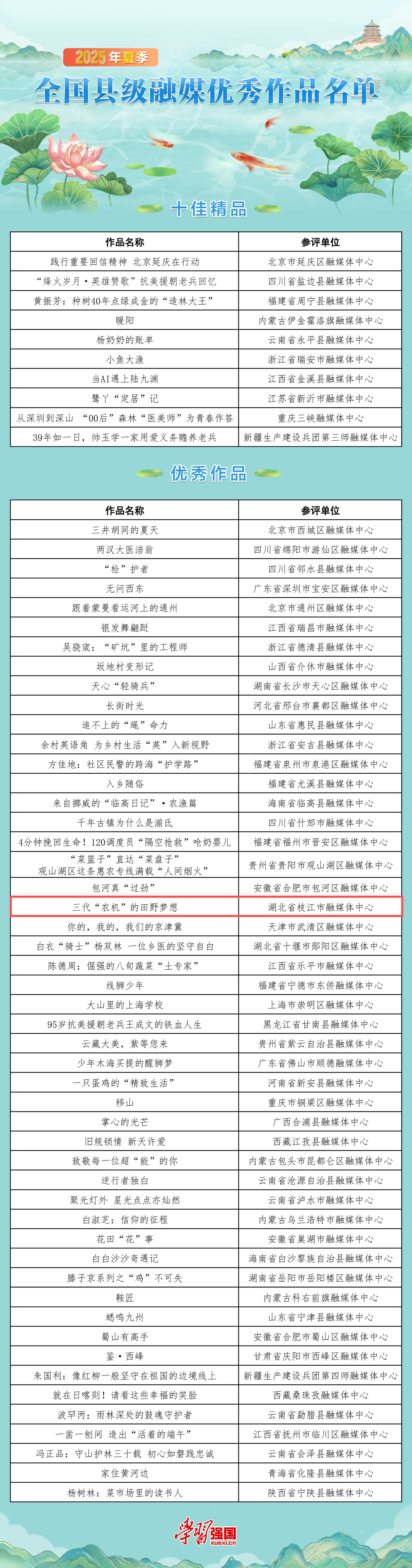 日前,由“学习强国”学习平台主办,各省(区、市)和新疆兵团学习平台协助组织、共同实施的2025年夏季全国县级融媒体中心优秀作品征集活动入选作品揭晓。其中,枝江市融媒体中心选送的《三代“农机”的田野梦想》荣获“优秀作品”奖。