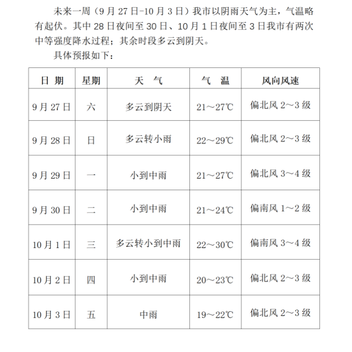 枝江未来一周天气预报(9月27日-10月3日)