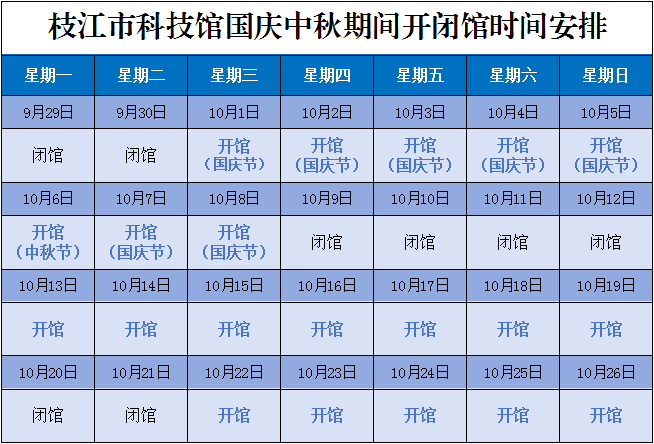 2025年国庆中秋期间,枝江市科技馆开闭馆时间如下表: