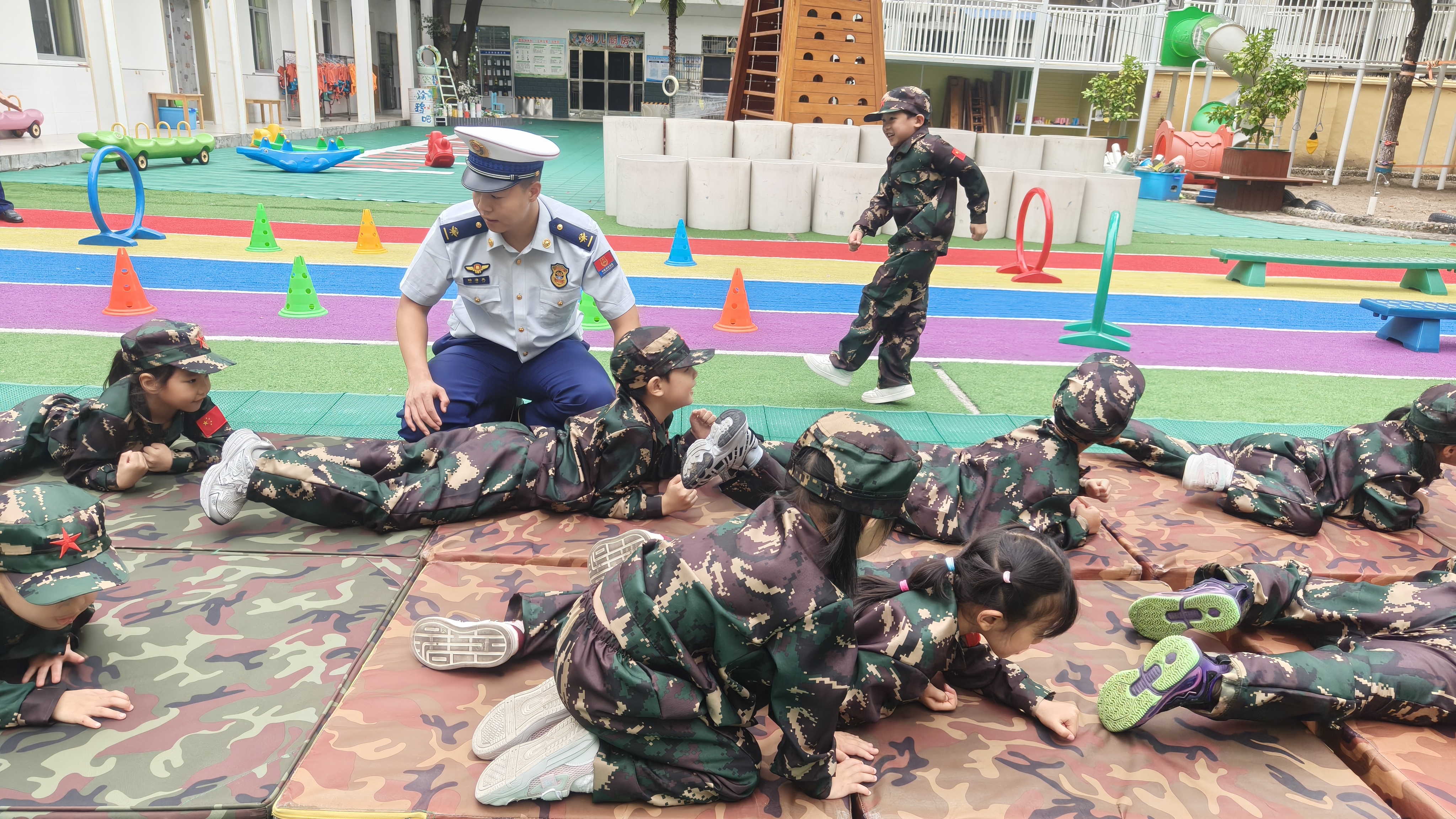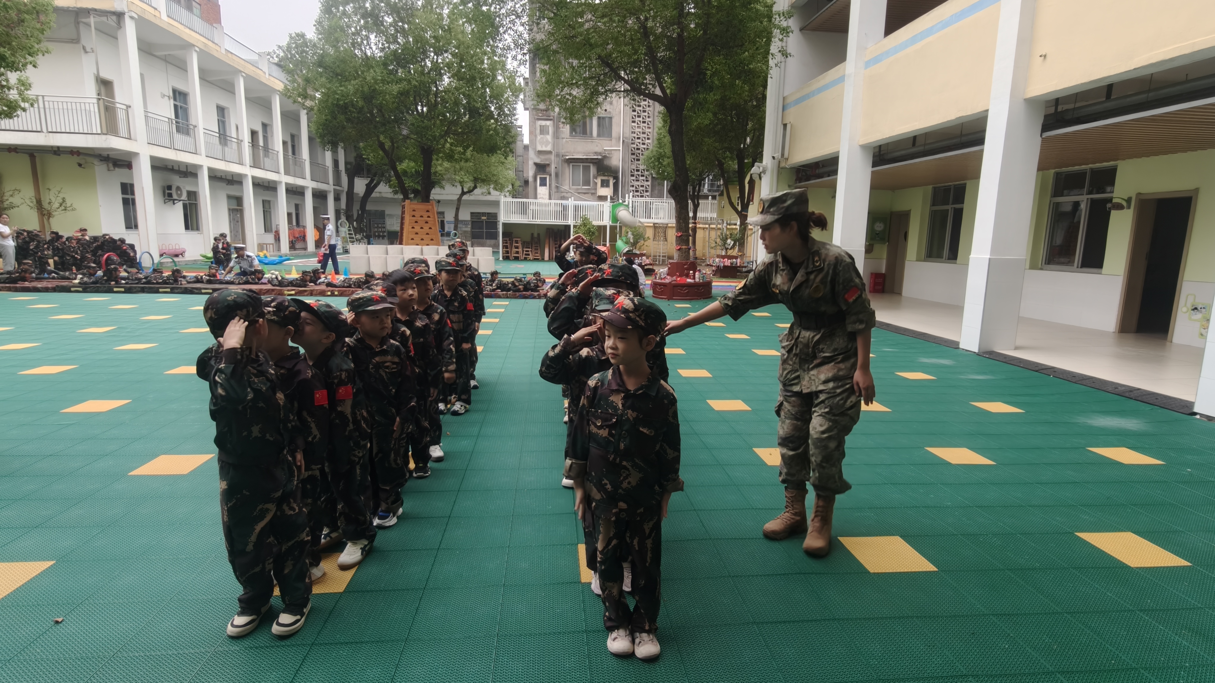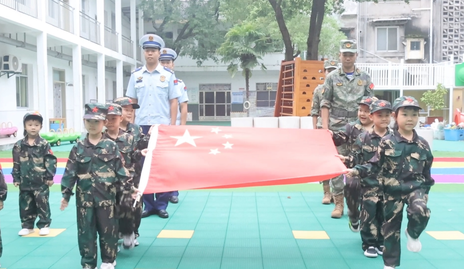 活动在庄严的升旗仪式中开始。大班组全体幼儿身着迷彩服,精神饱满,高唱国歌,注视五星红旗冉冉升起。