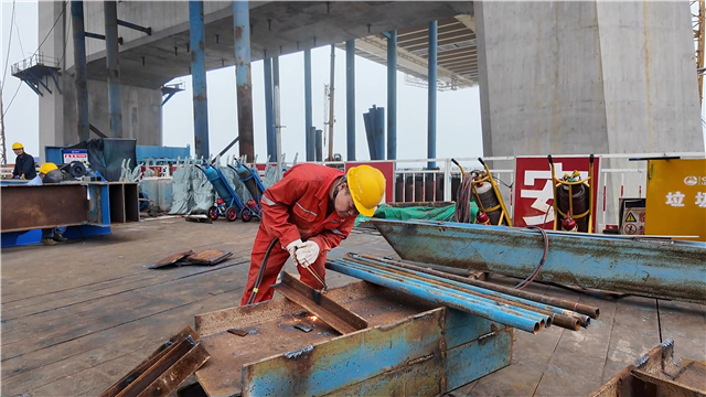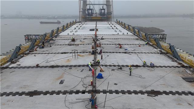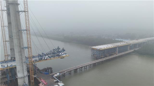 据现场技术员伍粤介绍,目前大桥南岸主塔施工已全部完成,全面进入上部构造施工阶段。正在进行的是6号钢箱梁的焊接和6号斜拉索梁端入锚,累计完成6对斜拉锁和15片钢箱梁的安装。预计年底完成边跨整体落梁以及边跨合龙。