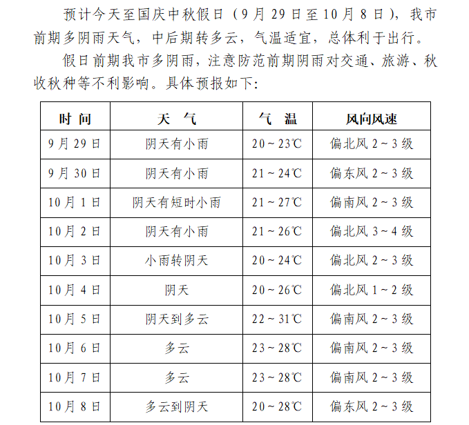 国庆中秋假日前期多阴雨天气:中后期转多云,总体利于出行
