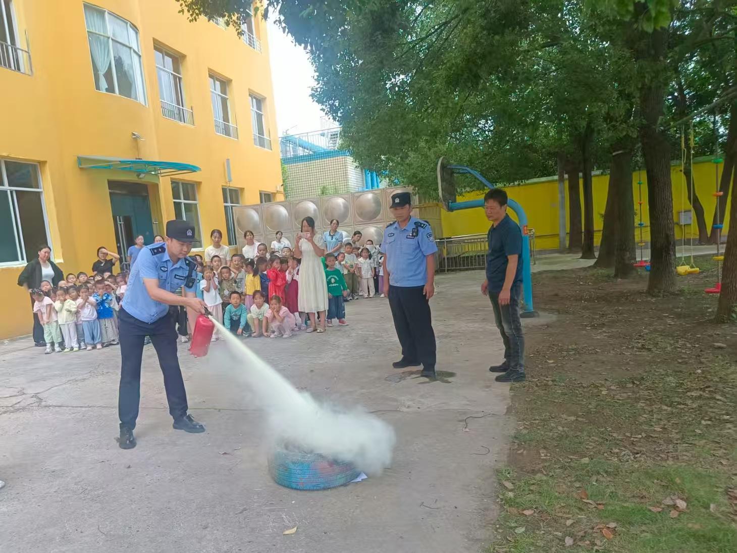 随着急促的警报声响起,消防演练正式开始。各班教师迅速组织幼儿进行疏散,孩子们用湿毛巾捂住口鼻,弯腰低姿,沿着预设的疏散路线有序撤离。仅用时1分34秒,全体师生便安全抵达操场,充分展现了扎实的安全教育成果。随后,百里洲派出所的雷警官通过互动问答和实物演示,为孩子们详细讲解了灭火器的使用方法和火灾逃生的关键要点。他还邀请教师代表进行实际操作演练,使师生不仅掌握了理论知识,更学会了实际操作技能。