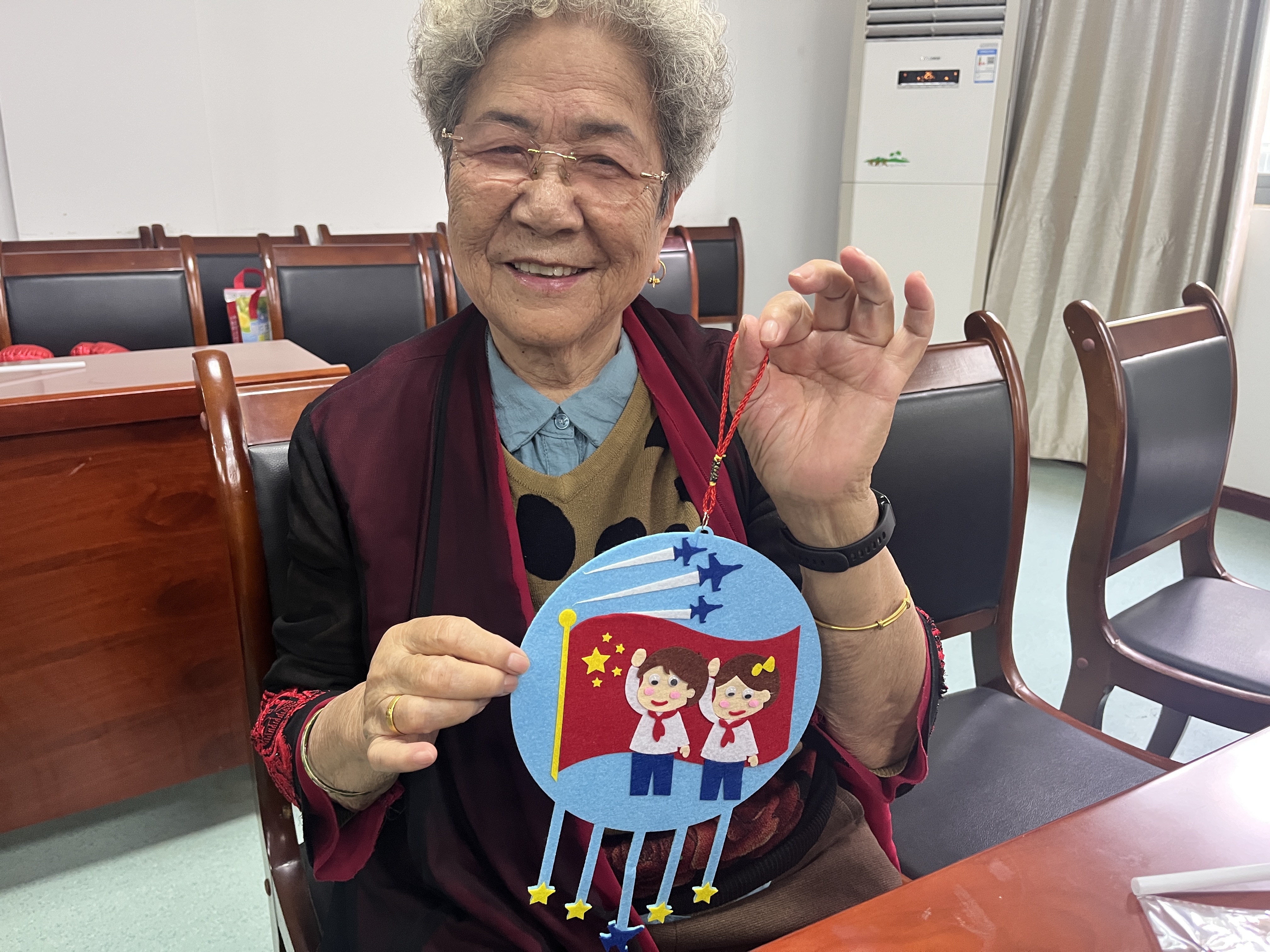 在“DIY国庆挂饰 巧手迎华诞”环节中,长辈们和工作人员一起动手,发挥创意,用巧思和双手制作国庆挂饰,为祖国母亲献上一份特别的礼物。工作人员为每位参与者发放了材料包,有的制作了一面面鲜艳的五星红旗,每一个星星都贴得整整齐齐;有的做了一个写有“祖国万岁”的爱心挂饰,护理员们在一旁协助大家,活动现场热火朝天。20分钟后,几位长辈上台展示自己的作品,每一件都饱含着对祖国的深情。随后,工作人员将这些充满爱意的作品挂在福利院的各个角落,让整个家园处处洋溢着节日的喜庆和对祖国的祝福。