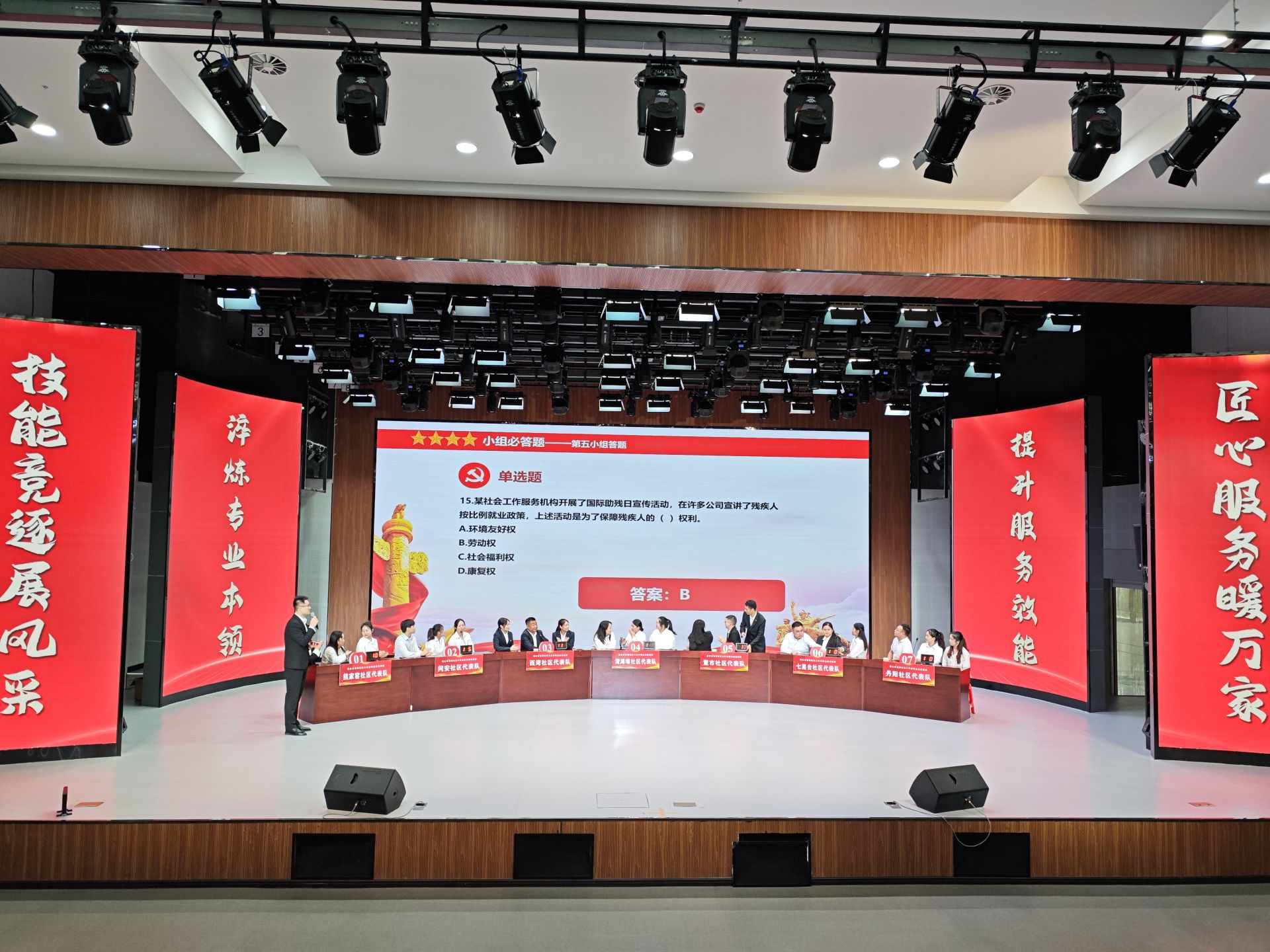 竞赛分为“业务比拼+主题演讲”两个环节。业务比拼环节涵盖党的二十届三中全会精神、习近平总书记关于社会工作的重要指示等多方面内容,设置了必答题、抢答题和风险题。14支队伍通过抽签分为A、B两组依次上场,选手们冷静思考、积极抢答,展现出扎实的业务知识功底。