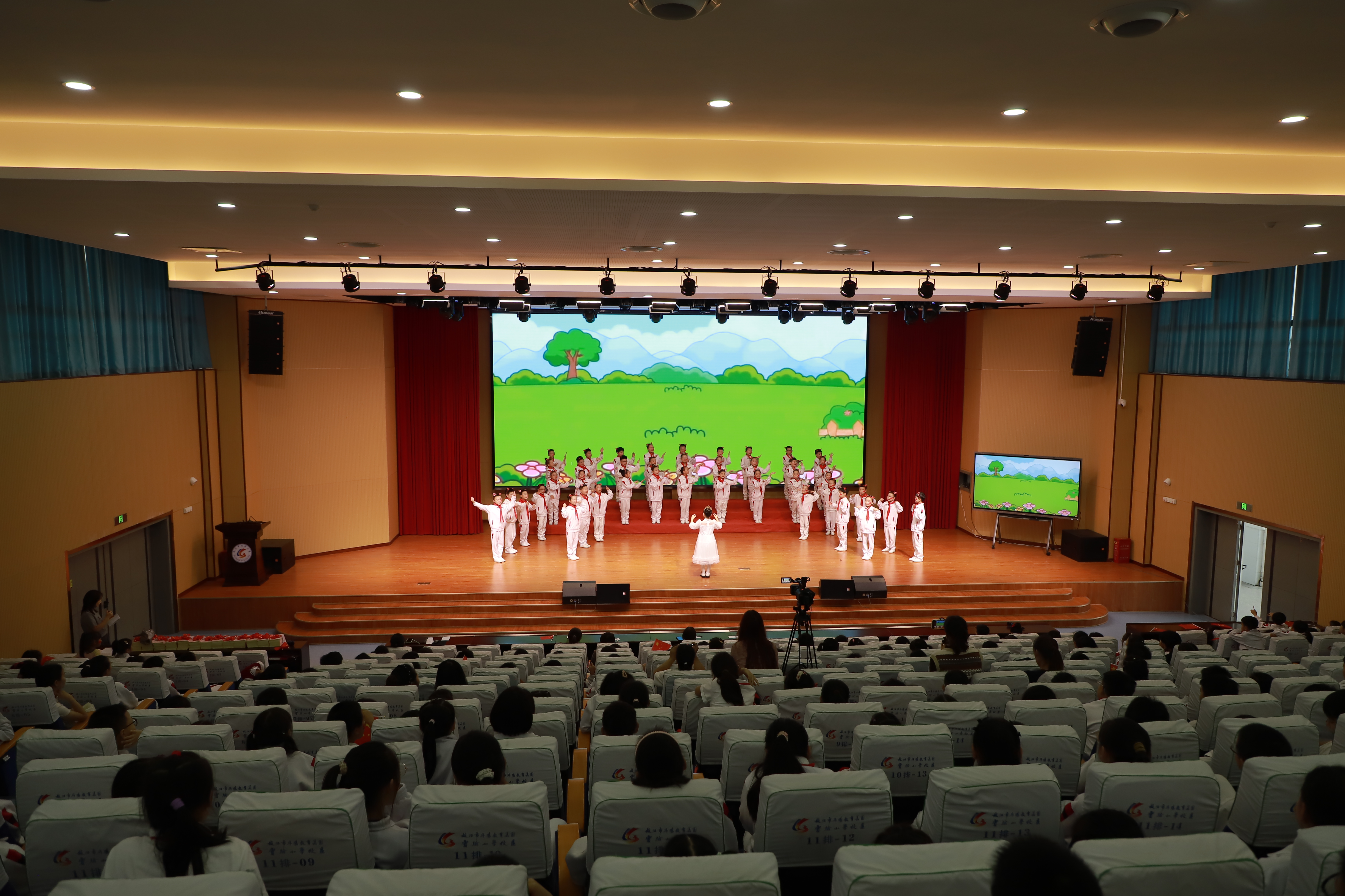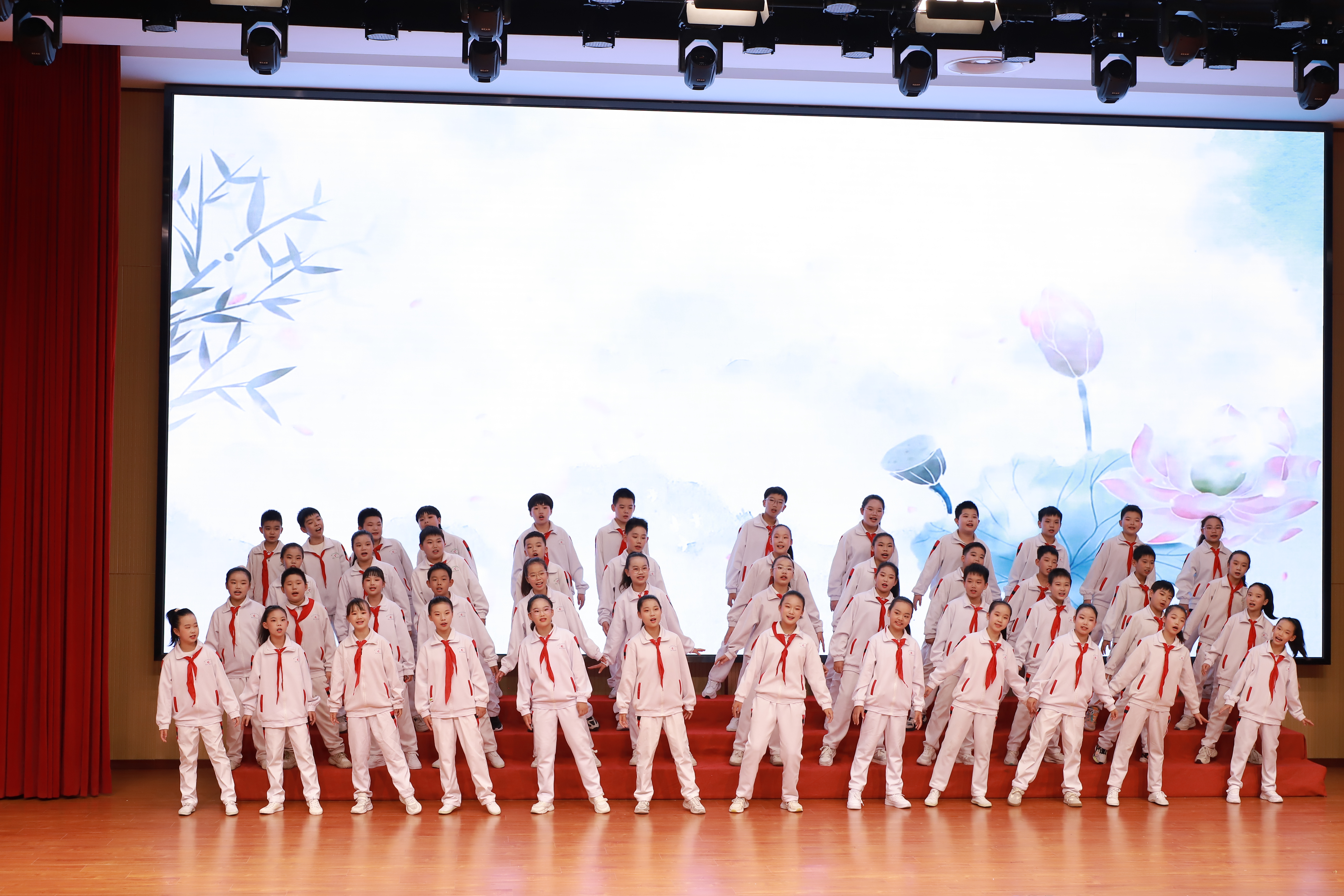 展演在二年级(8)班的《祖国祖国我们爱你》中拉开帷幕。一张张稚嫩脸庞上的红贴纸与现场灯光交相辉映,现场瞬间化作热烈的红色海洋。令人耳目一新的是三年级(1)班的《如愿》:伴随着AI语音的开场自我介绍,42名学子以“合唱+整齐手势舞”为核心形式,将歌曲中的家国情怀娓娓道来。背景视频同步播放的既有高铁飞驰、航天发射等祖国飞速发展的纪实片段,也有班级学子与国旗的温馨合影、校园里“童心向党”主题班会等爱国实践场景,将“爱祖国”与“爱家乡”“爱成长”紧密串联。整场表演一气呵成,落幕时台下掌声雷动,不少师生直呼“震撼”。