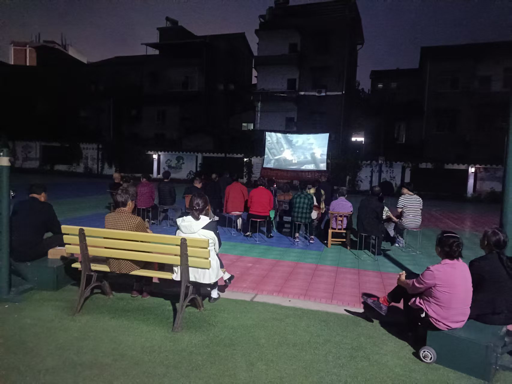 活动当天,社区工作人员提前布置场地,拉好宣传横幅、调试放映设备。傍晚时分,居民们陆续到场,老人们带着孩子、邻里间结伴而来,大家围坐在一起,期待着电影开播。