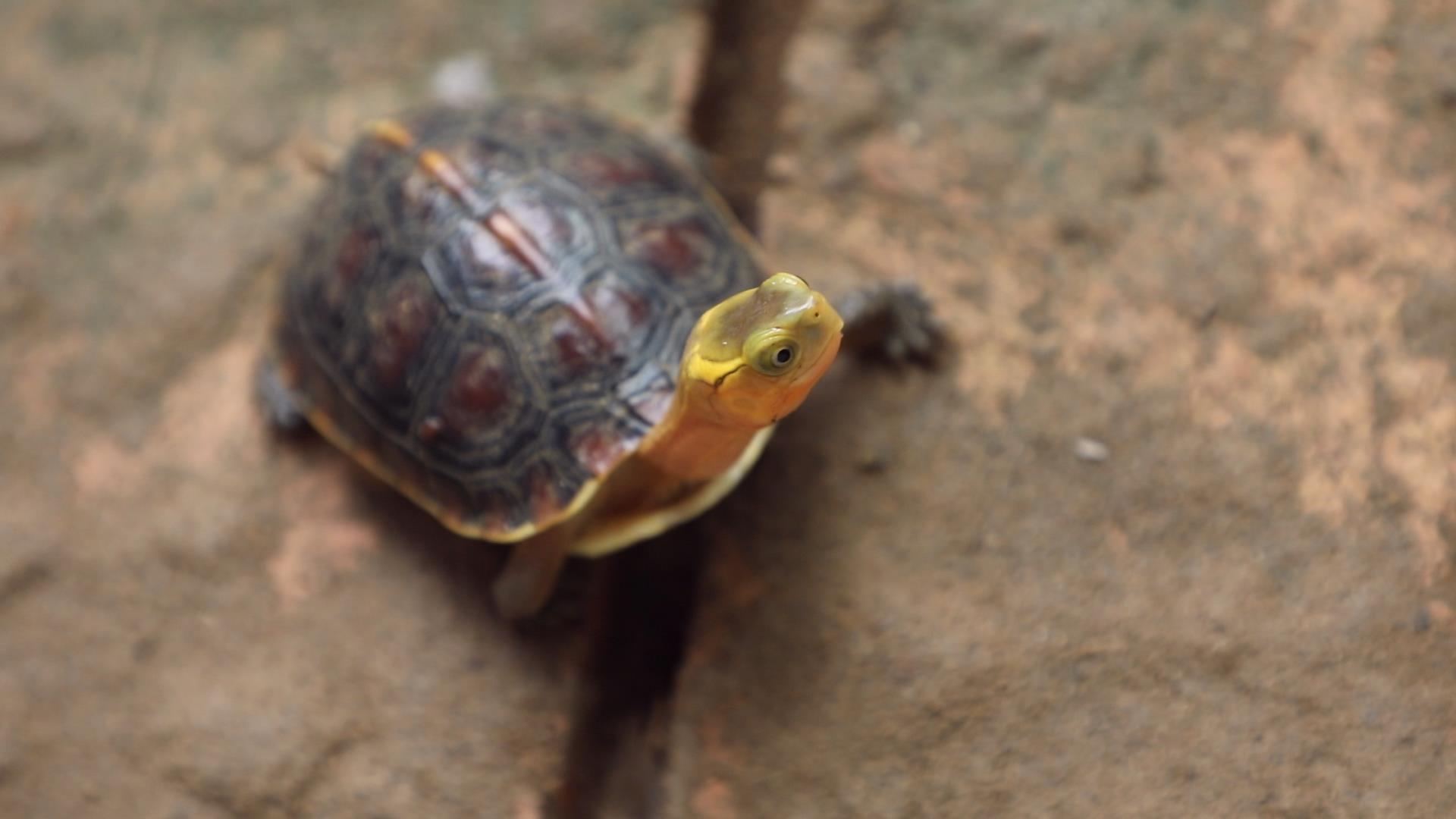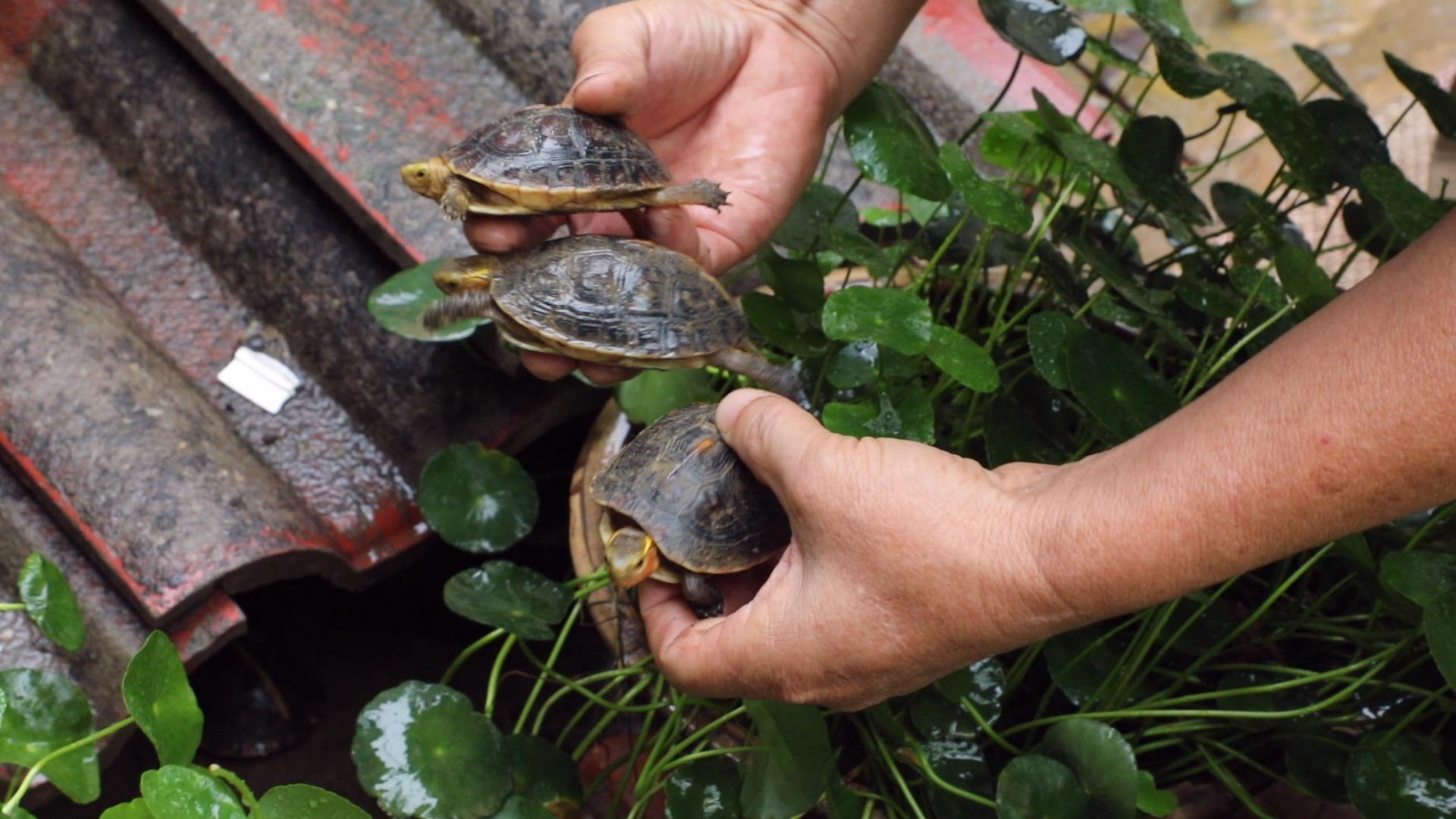 走进方华清的农家小院,数口养龟池格外显眼。在方华清亲手打造的生态龟池中,绿意葱茏间,一只只黄缘闭壳龟在草间和石板下悠闲游走,这类观赏龟属中国本土品种,因观赏价值高、适应性强,成了市场 “香饽饽”,方华清所繁育的龟品相佳,耐病力强,更是受到了广州等沿海城市养龟爱好者的欢迎,一只好的幼龟往往能卖出数千元的高价。