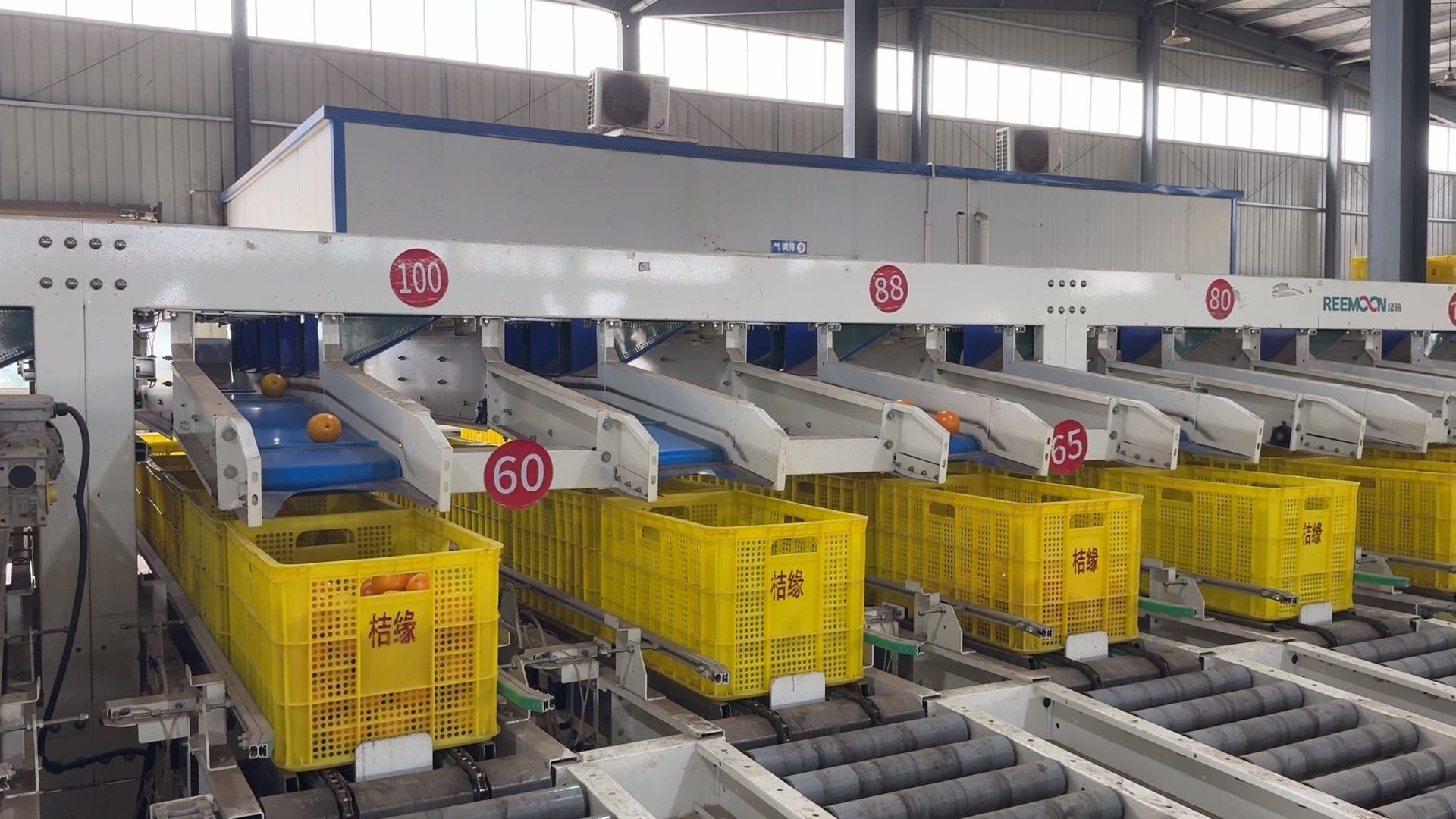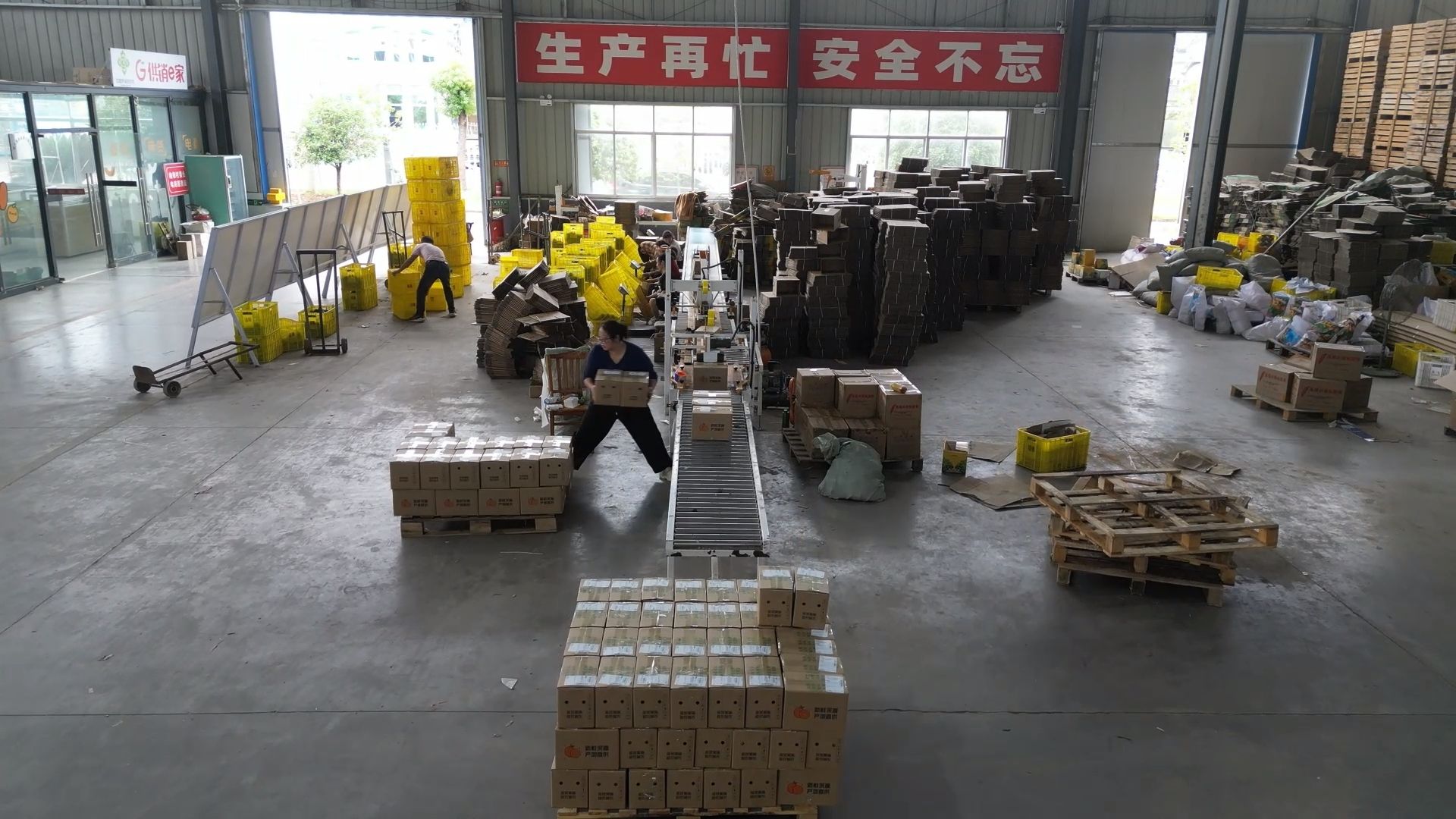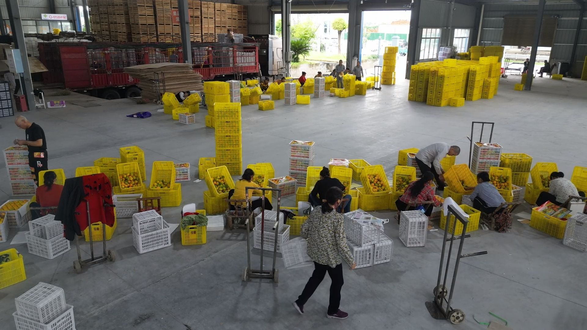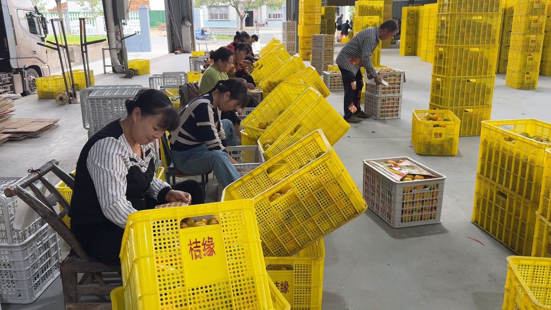 在合作社的加工车间内,工人们正紧张有序地进行蜜橘的分拣、包装和搬运工作。机械化的分类设备高效运转,一筐筐金黄饱满的蜜橘在经过精细包装后,被迅速运往储存区或直接装车发往各地。线上销售区域同样忙碌,快递包裹在传送带上快速流转,工作人员熟练地进行打包、贴单,确保订单及时发出。