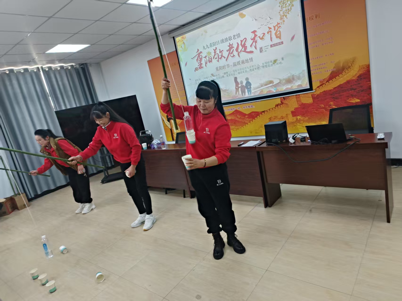 活动伊始,社区工作人员向全体老人致以真诚的节日祝福。随后开展一系列趣味活动,现场充满欢声笑语。在备受老人们喜爱的“旱地钓鱼”游戏中,大家暗自比拼着耐心与巧劲;在妙趣横生的“赶猪入圈”游戏中,大家手持赶猪棒,稳健地将“小猪”赶回圈内,场面热烈又逗趣。老人们全情投入,仿佛重拾童年乐趣,脸上洋溢着灿烂的笑容。