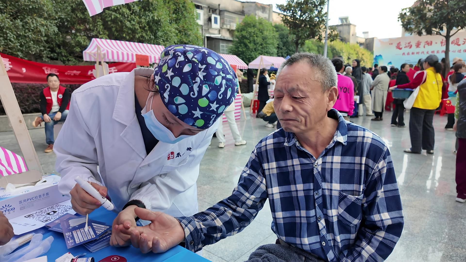 另一边的文明市集同样热闹。市集整合了美食体验、爱心义诊、农副产品展销、公益服务、文明宣传等多种元素,贴近居民日常生活需求,不少摊位前排起了小队,免费理发、磨刀等服务尤其受到老年群体的欢迎。
