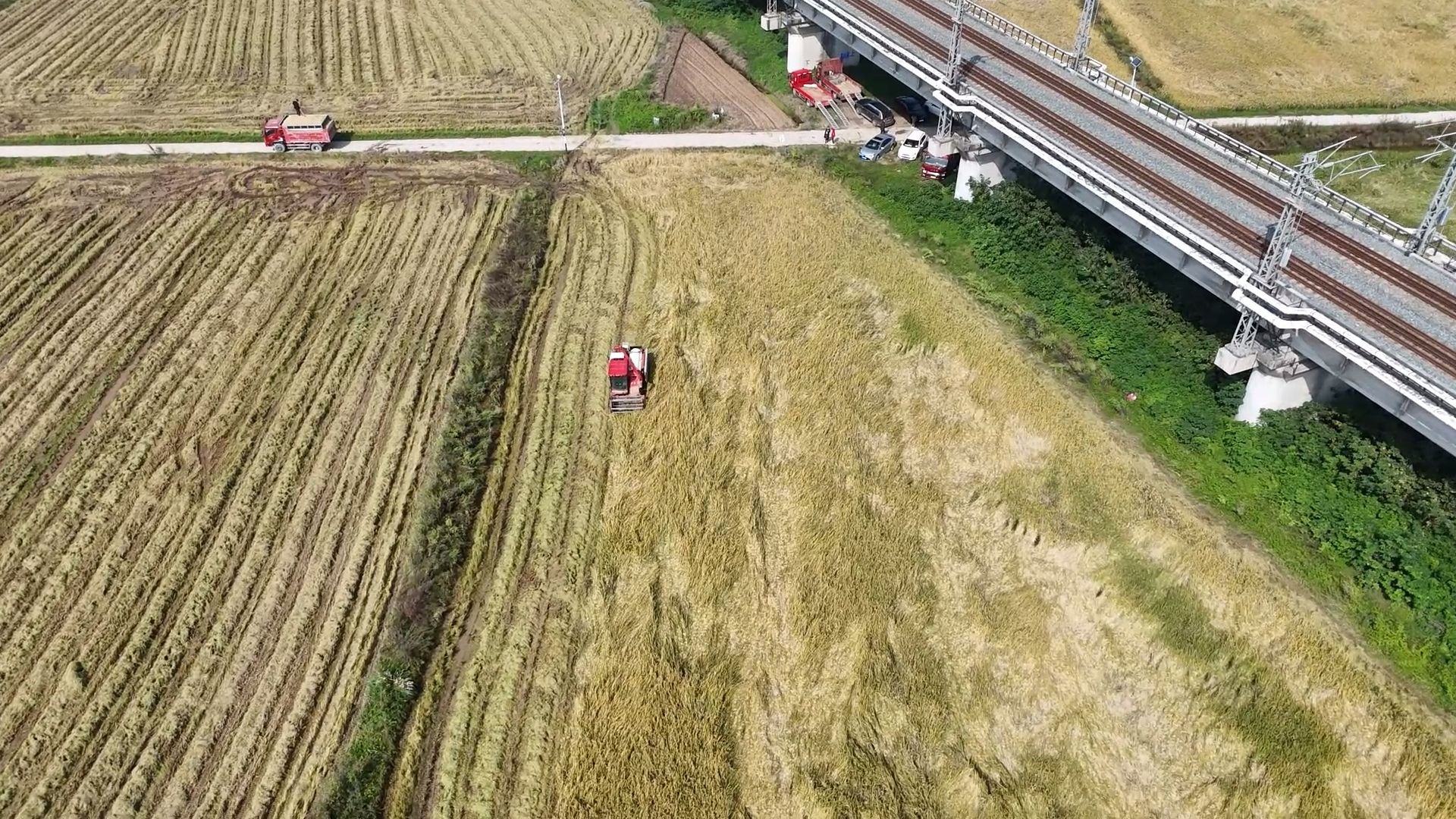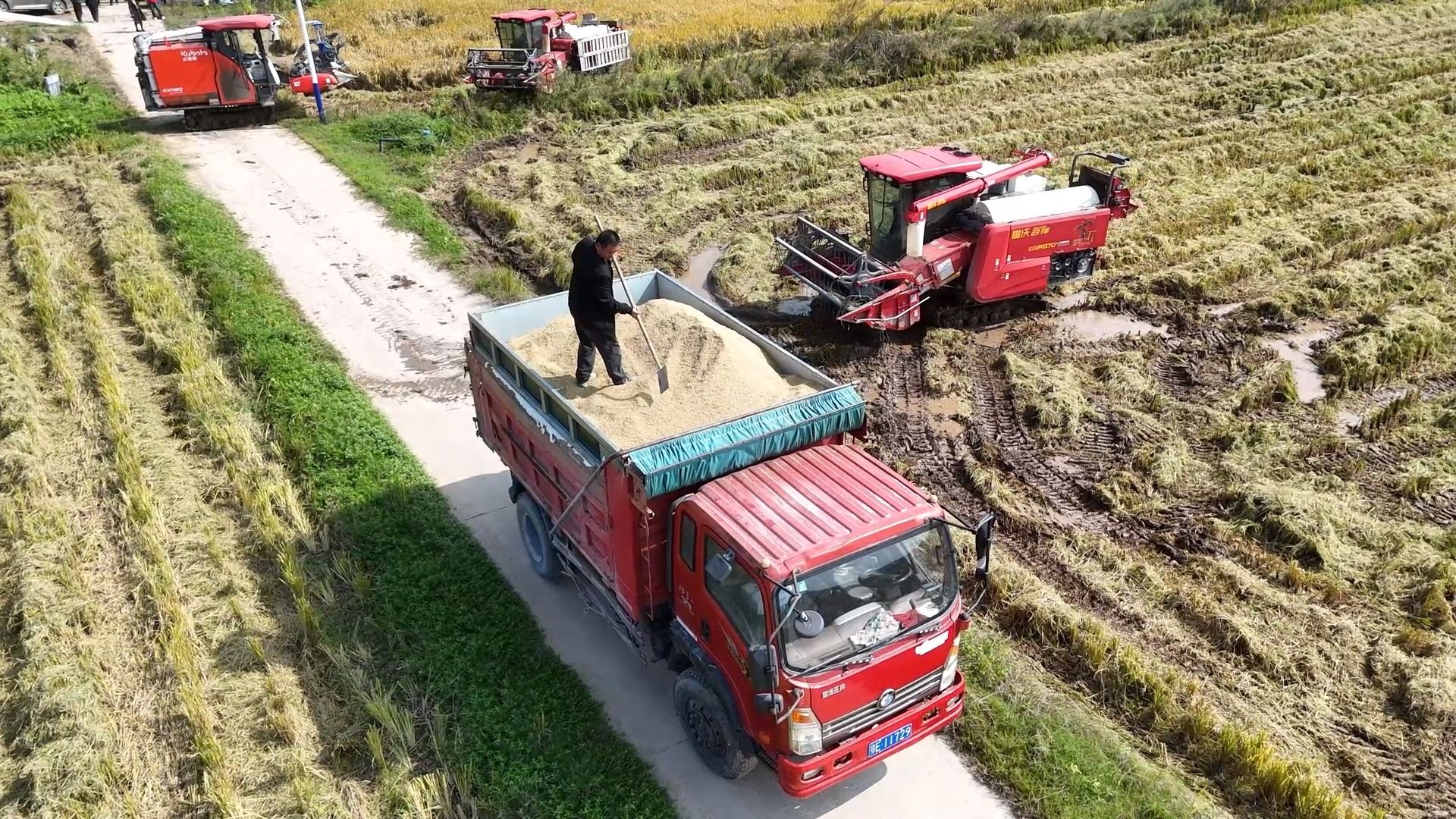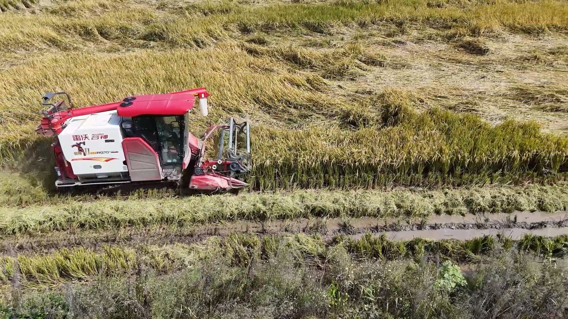 在董家湾村连片的虾稻共作基地,两台大型收割机开足马力穿梭于稻浪间,同步完成收割、脱粒作业。转眼间,一排排水稻被吸入机身,粉碎后的秸秆从机尾均匀排出实现还田,颗粒饱满的稻谷则直接输送至随行的运粮车,确保颗粒归仓,现场处处洋溢着丰收的喜悦。