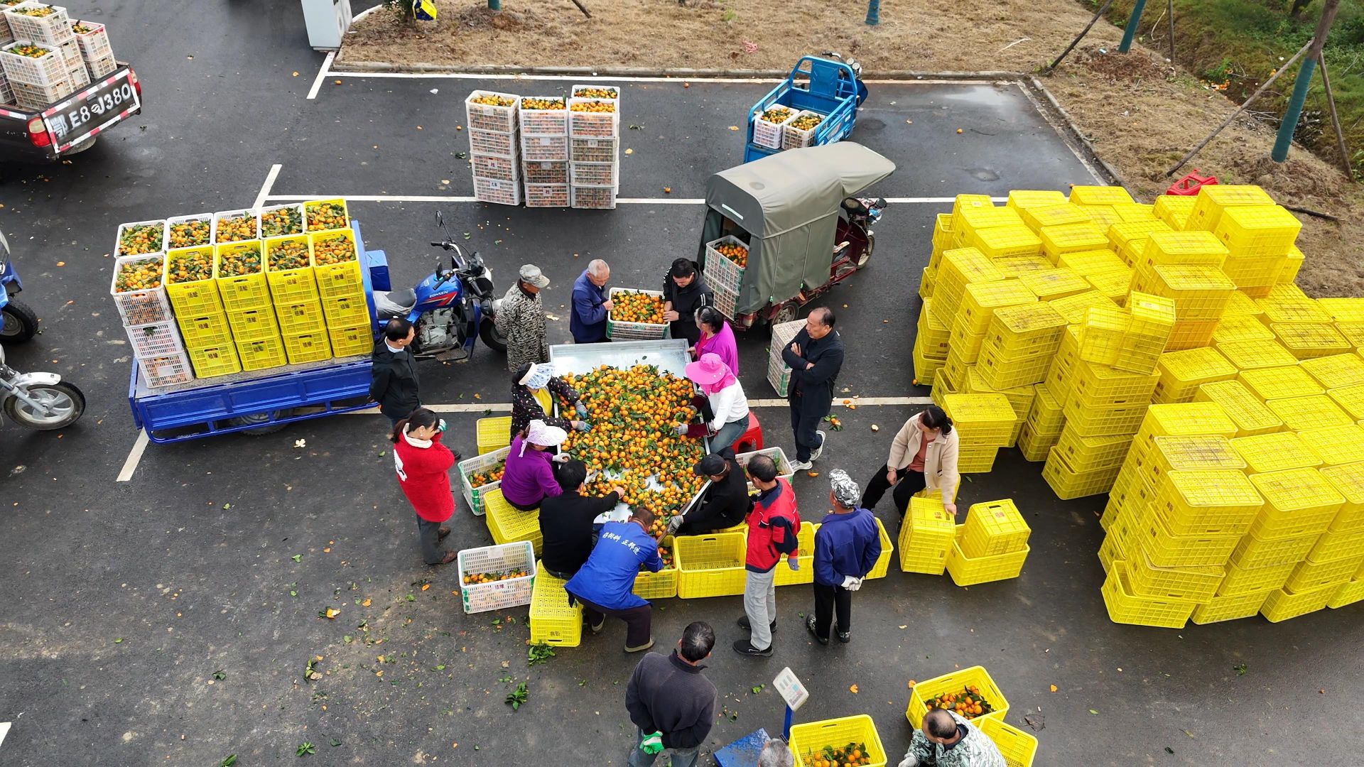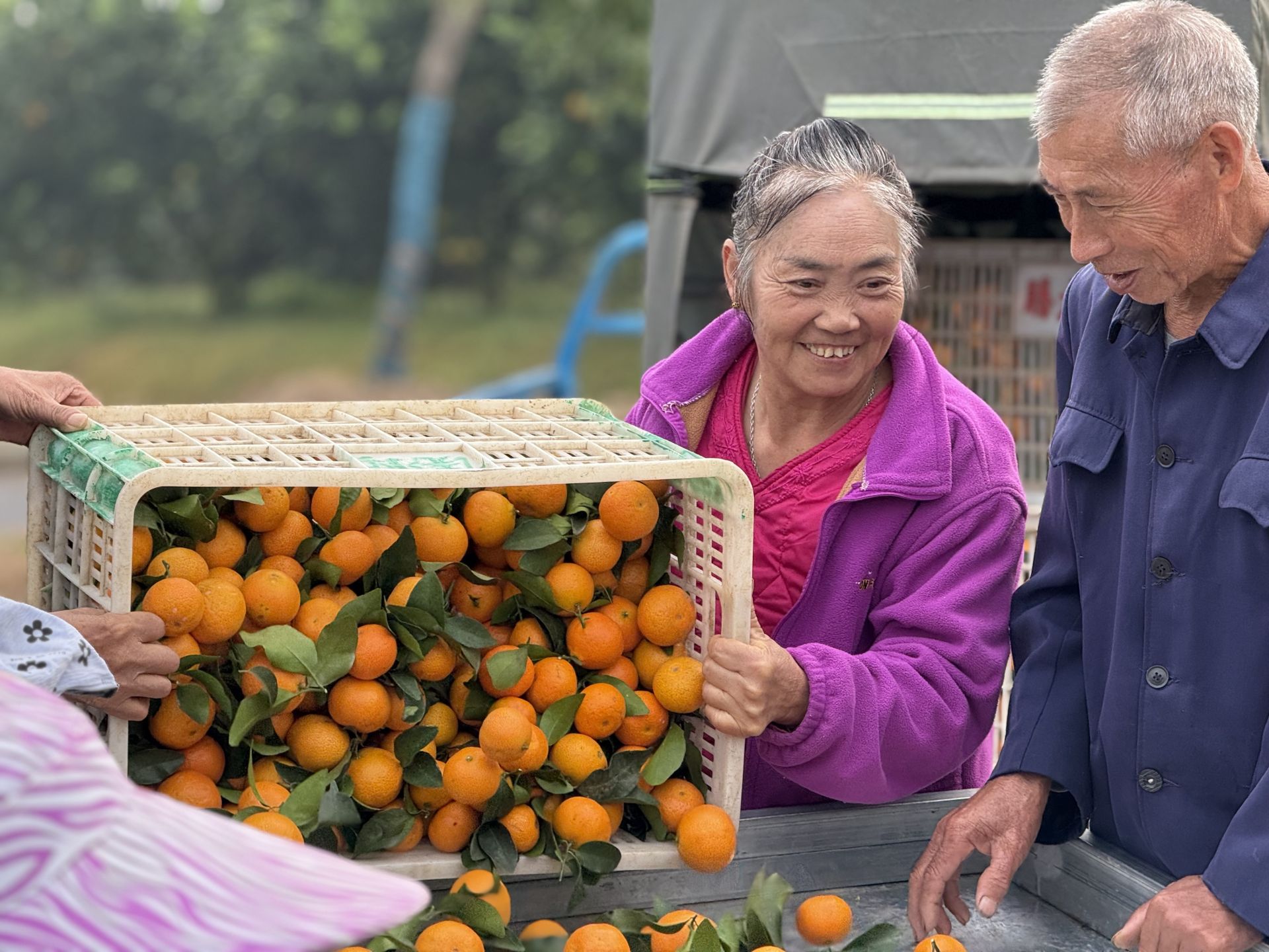 上午九点,向巷村的收购广场已是一派繁忙景象。村民们骑着满载砂糖橘的三轮车,陆续从田间赶来。车斗里的砂糖橘个个圆润饱满、色泽鲜亮,在阳光的映照下泛着诱人的光泽。大家笑着相互招呼,手脚麻利地卸果、分拣,有序排队等候挑拣、称重,整个现场忙而不乱、秩序井然。