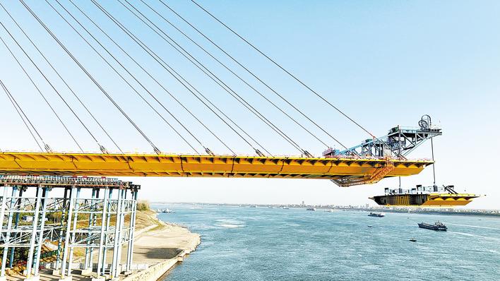 【湖北日报】枝江长江大桥开吊钢箱梁 2025-11-27 09:27 0 11月25日,枝江长江大桥施工现场正在进行钢箱梁吊装作业,标志着大桥建设已全面转入上部结构施工阶段。枝江长江大桥是当枝松高速公路的控制性工程,是当前世界跨径最大的钢-UHPC组合梁斜拉桥,预计于2026年建成通车。 来源:湖北日报(刘卫东 摄)