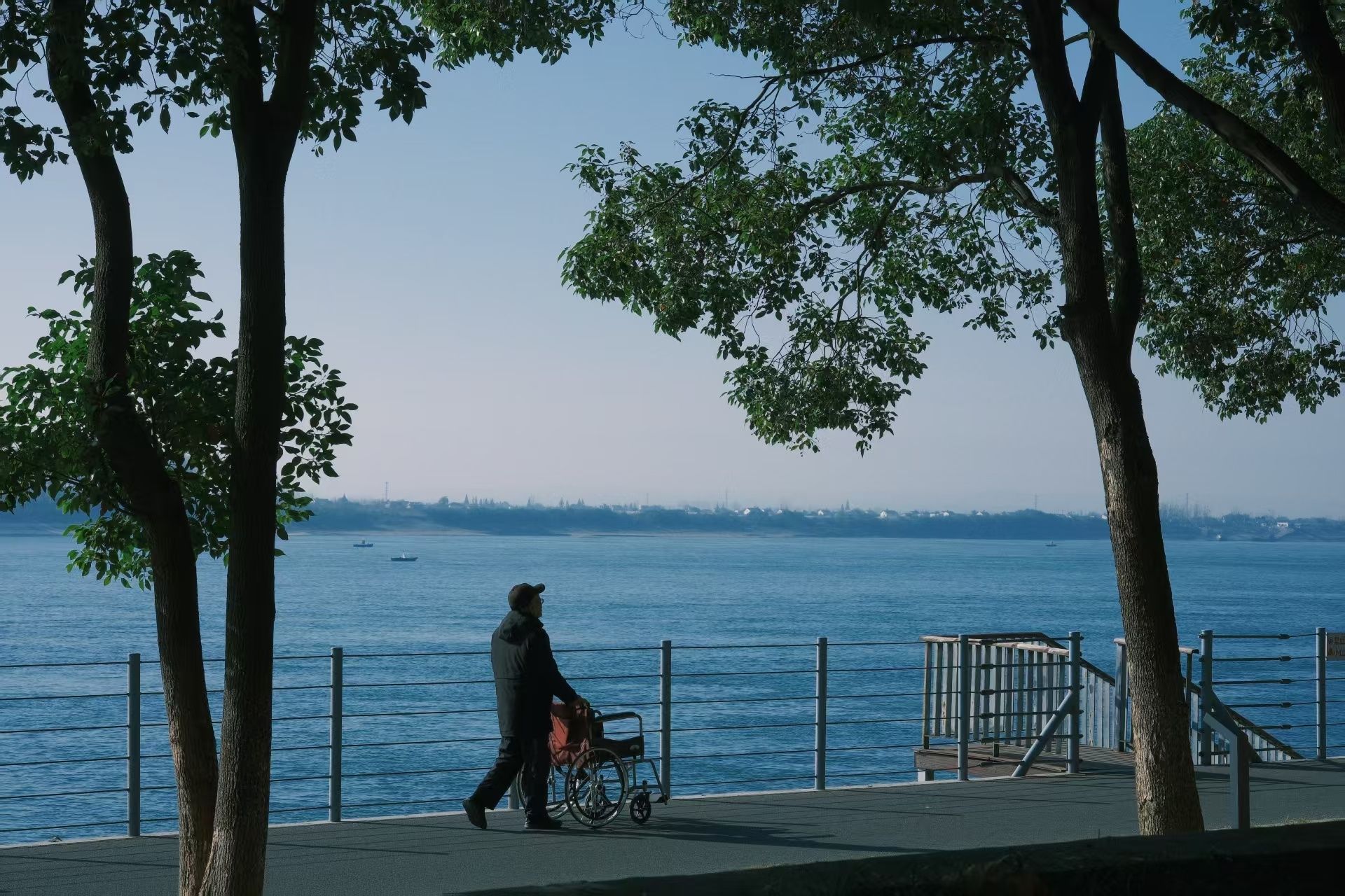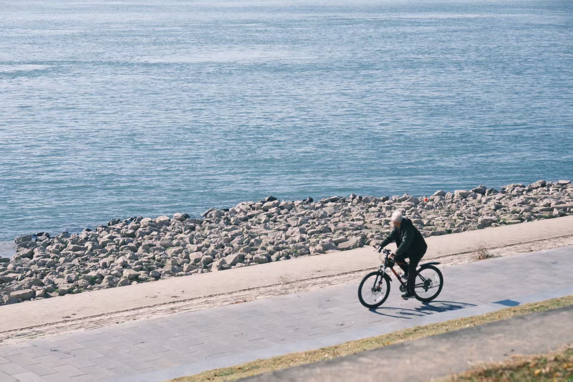 沿江步道上,晨练的老人在健身器材上舒展筋骨,孩童在步道上追逐嬉戏,构成一幅充满烟火气的冬日生活图景。