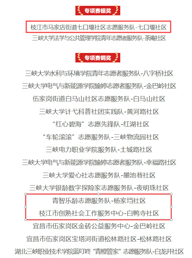 其中,马家店街道熊家窑社区在主体赛中斩获铜奖,马家店街道七口堰社区志愿服务队-七口堰社区在专项赛中斩获银奖,青智乐龄志愿服务队-杨家垱社区、枝江市创熟社会工作服务中心-白鸭寺社区分别在专项赛中斩获铜奖。