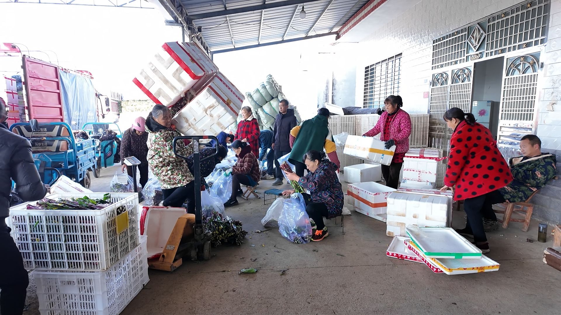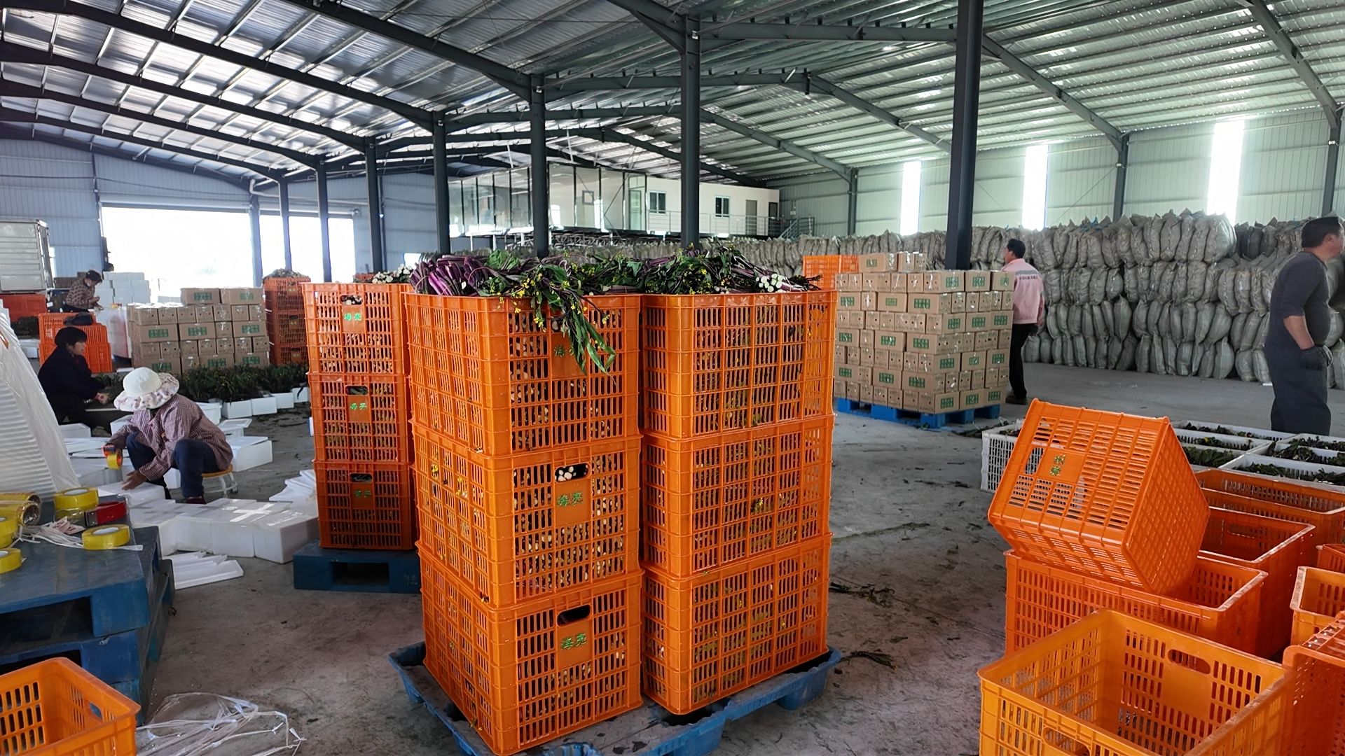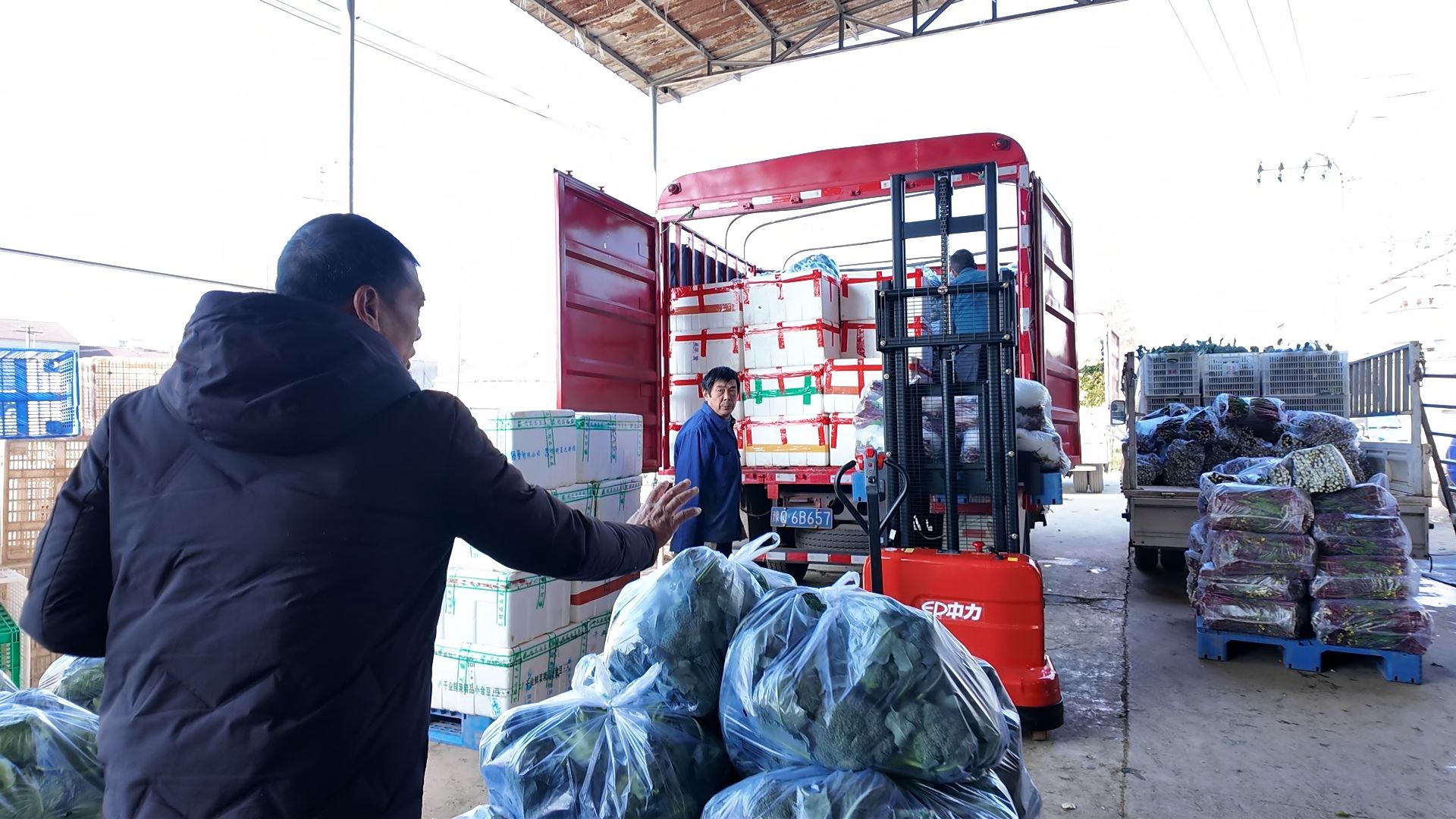 在赵楼子村的家华蔬菜专业合作社,负责人詹家华正指挥着工人将一袋袋新鲜蔬菜过磅、分装。他穿梭现场统筹协调,确保各环节衔接顺畅。现场十几名工人分工明确、手脚麻利,有序打包西蓝花、有机花菜、红菜薹、大蒜苗等蔬菜。