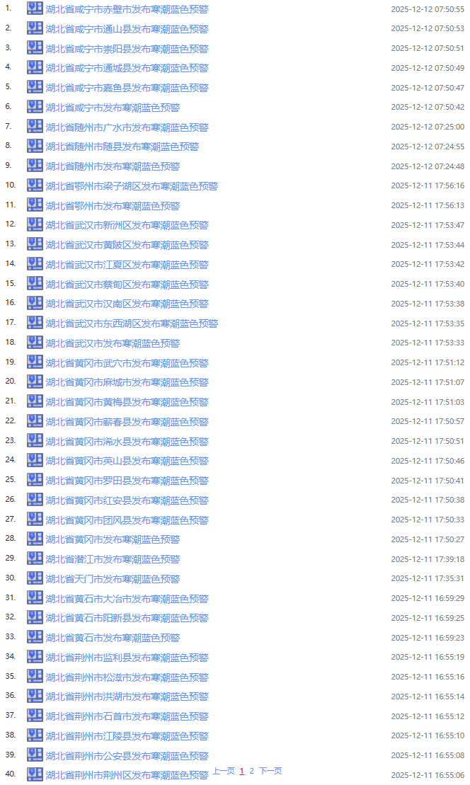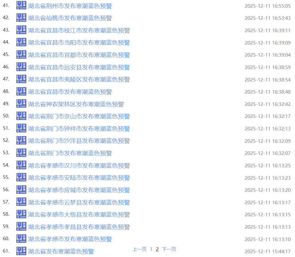 从昨天15时44分到今晨8时20分湖北连发61条寒潮预警