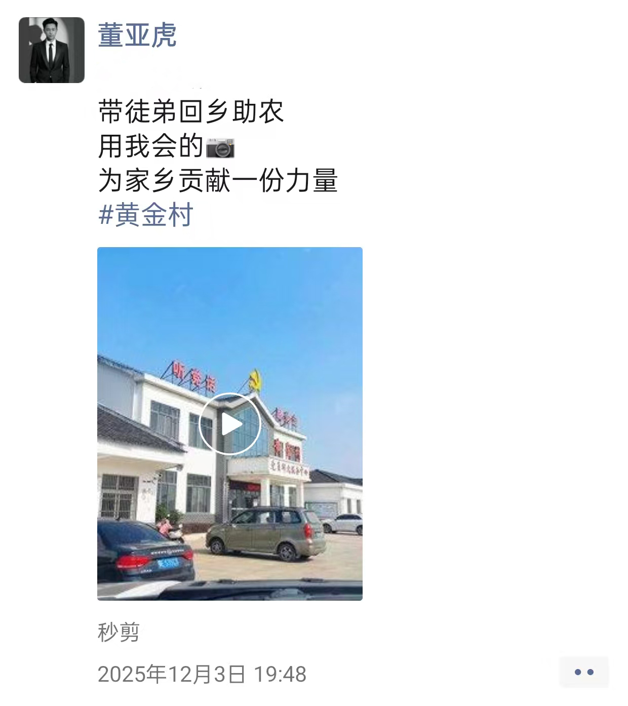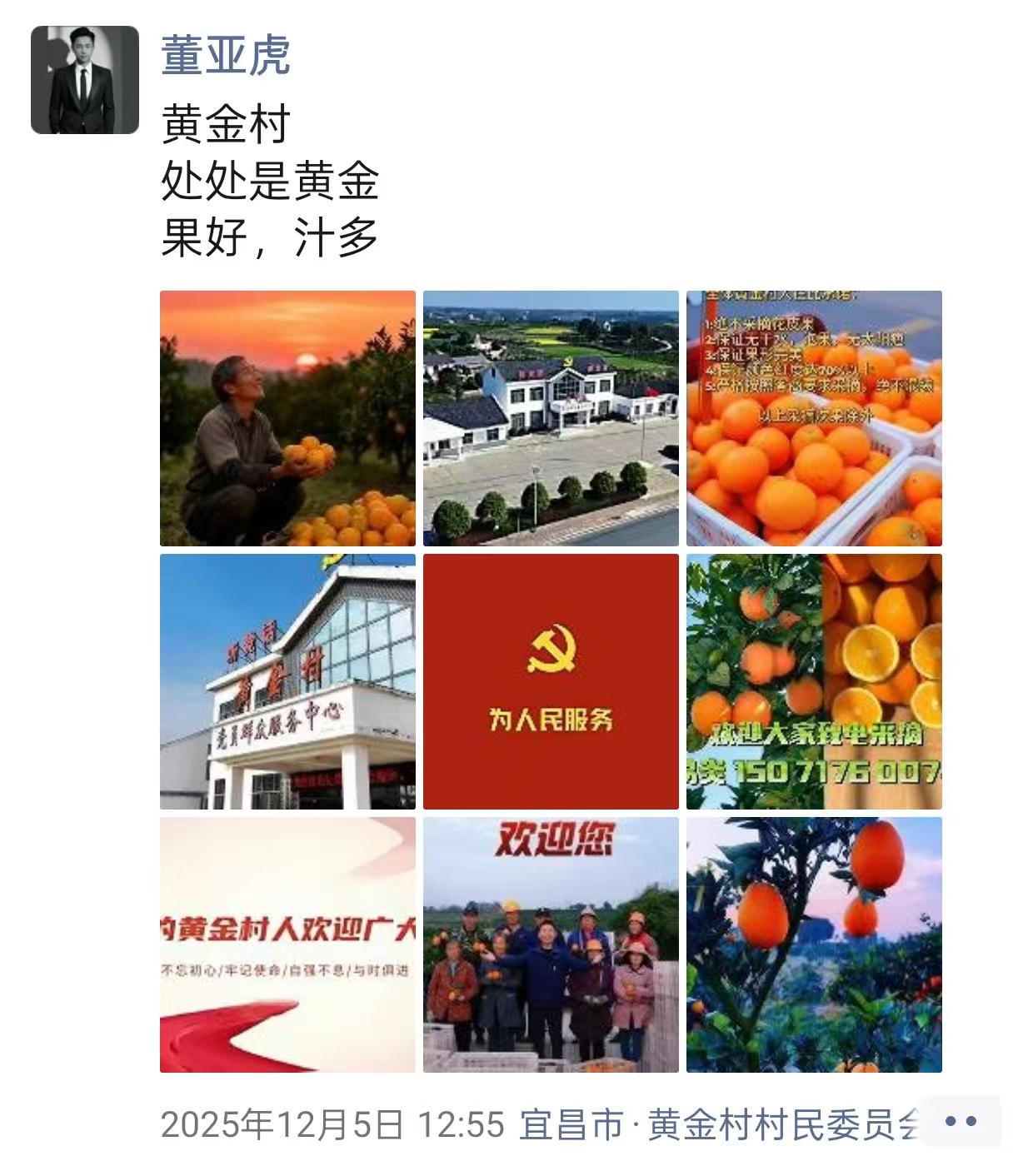 在村“两委”的紧密配合与支持下,脐橙短视频营销小组用20天时间成功将黄金村的2000万斤脐橙销售一空。“多亏了董亚虎这孩子和村干部们!”村民张大爷激动地说。“我只是做了自己应该做的事。看到家乡的脐橙卖得好,乡亲们开心,我就觉得一切都值了。”董亚虎回应道,如果有需要,我将继续利用我的专业所长,为家乡的发展贡献自己的一份力量。”