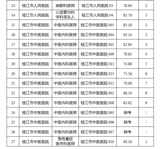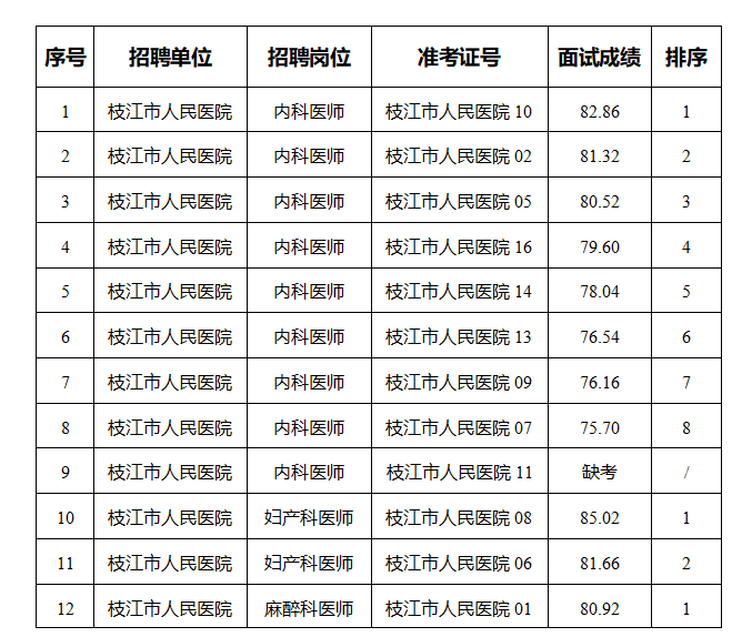 枝江市2026年“招才兴业”卫生健康系统事业单位人才引进公开招聘·武汉大学站面试成绩公告 2025-12-22 16:08 0 根据《枝江市2026年“招才兴业”卫生健康系统事业单位人才引进公开招聘公告·武汉大学站》,现将枝江市2026年“招才兴业”卫生健康系统事业单位人才引进公开招聘·武汉大学站面试成绩予以公告。 枝江市卫生健康局 2025年12月22日