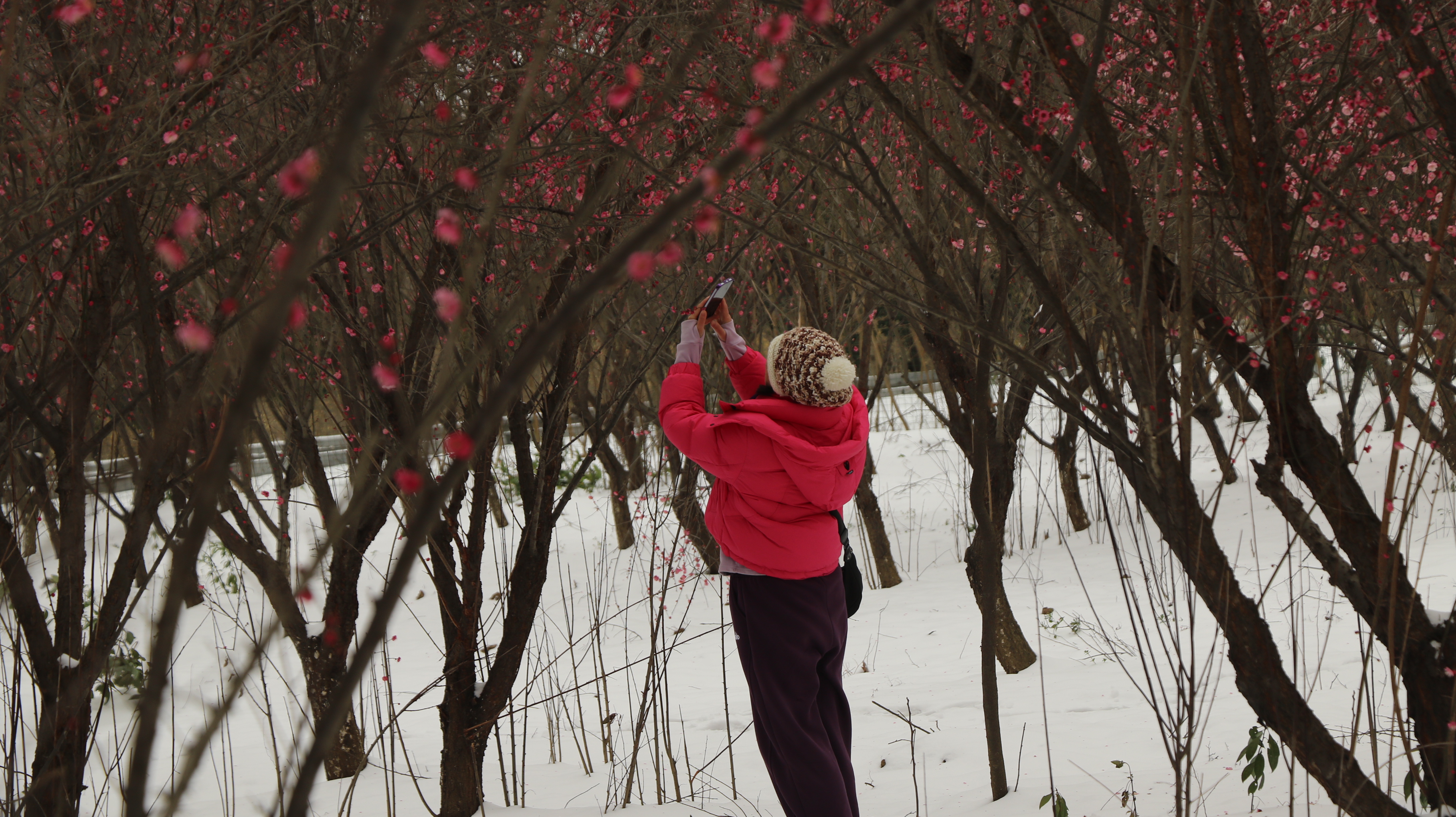 园林内,赏梅的游客络绎不绝,大家踏着薄雪,漫步在梅林小径间。有的驻足花下,细细端详梅花的娇美姿态;有的举起相机、手机,捕捉雪梅相依的绝美瞬间;还有的与家人朋友并肩而行,在梅香中畅谈欢笑,尽情感受冬日乡村的独特韵味。“早就听说问安殿春园林的梅花开得好,恰逢下雪,过来一看果然名不虚传,随手一拍都是美景。”来自宜昌城区的游客王先生说道。