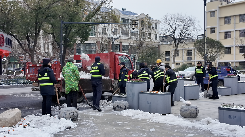 枝江市城市管理执法大队市容中队副中队长向金昊介绍,“此次行动共组织环卫工人680余名、执法队员110余名,对城区主次干道、人行道及路口全覆盖清扫转运。”当天,市城管局累计清理积雪面积约4.5平方公里,转运积雪50余车,切实守护市民出行安全顺畅。